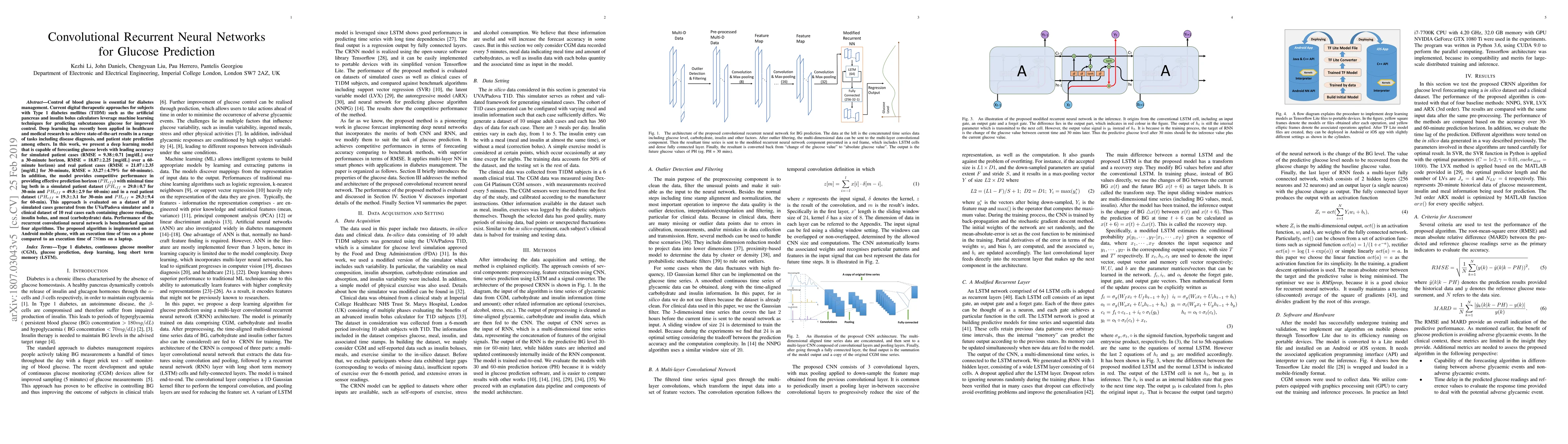 This paper proposes a convolutional recurrent neural network for predicting glucose levels in Type 1 diabetes patients, achieving RMSE of 9.38 mg/dL for 30-minute and 18.87 mg/dL for 60-minute forecasts in simulated data, and competitive performance in real patient data. The model also demonstrates effective prediction horizons and efficient execution on mobile devices.
