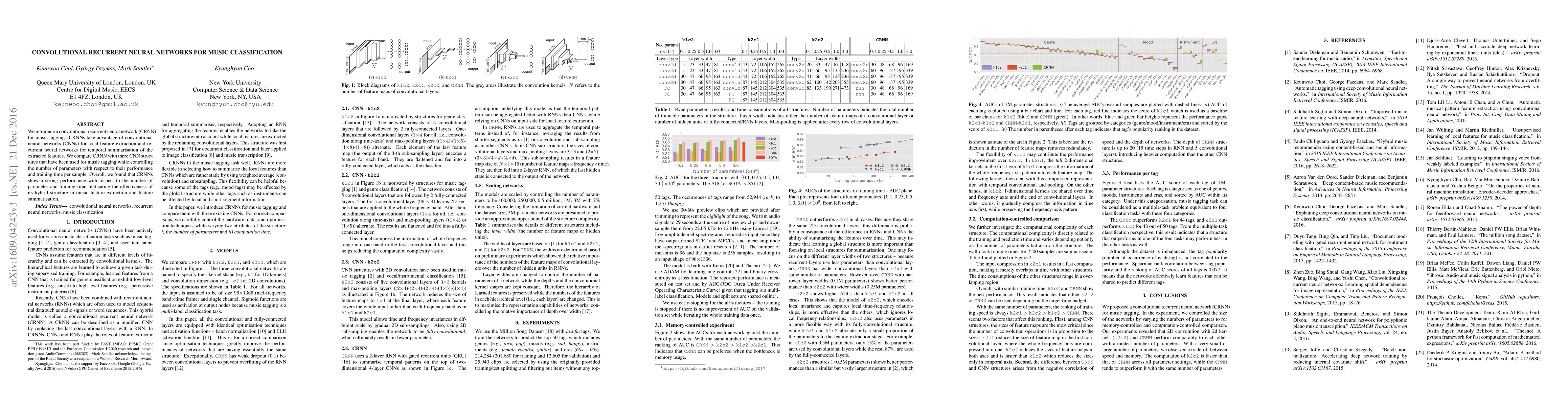 This paper proposes a convolutional recurrent neural network (CRNN) for music tagging, leveraging CNNs for feature extraction and RNNs for temporal summarization. The study finds that CRNNs outperform traditional CNNs in terms of performance, parameter efficiency, and training time.