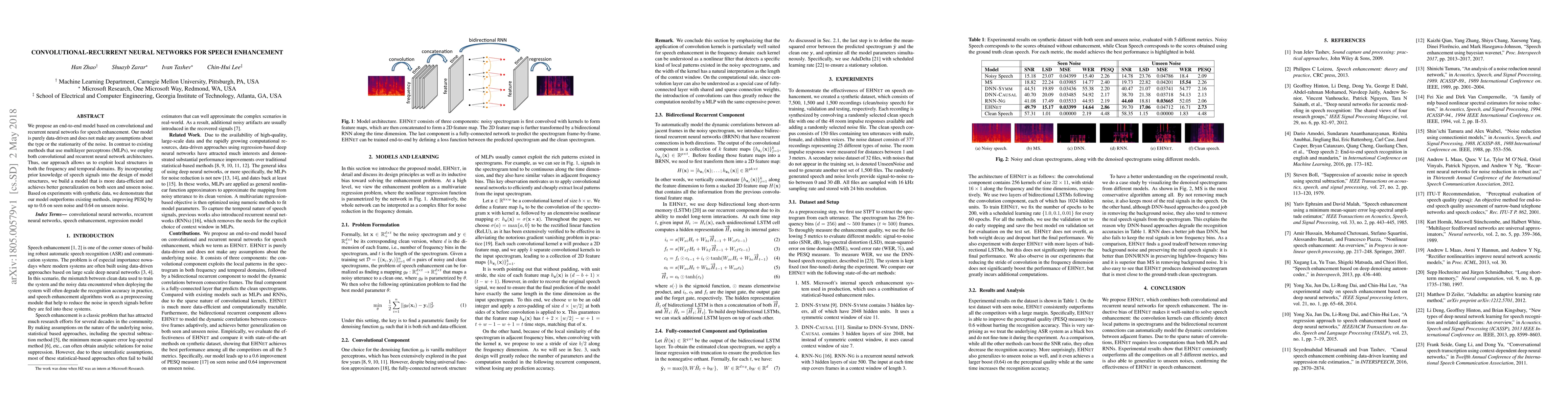 This paper proposes an end-to-end convolutional-recurrent neural network model for speech enhancement, achieving better performance than existing methods by exploiting local structures in both frequency and temporal domains. The model demonstrates significant improvements in PESQ scores, up to 0.64 on unseen noise, showcasing its effectiveness and generalization.