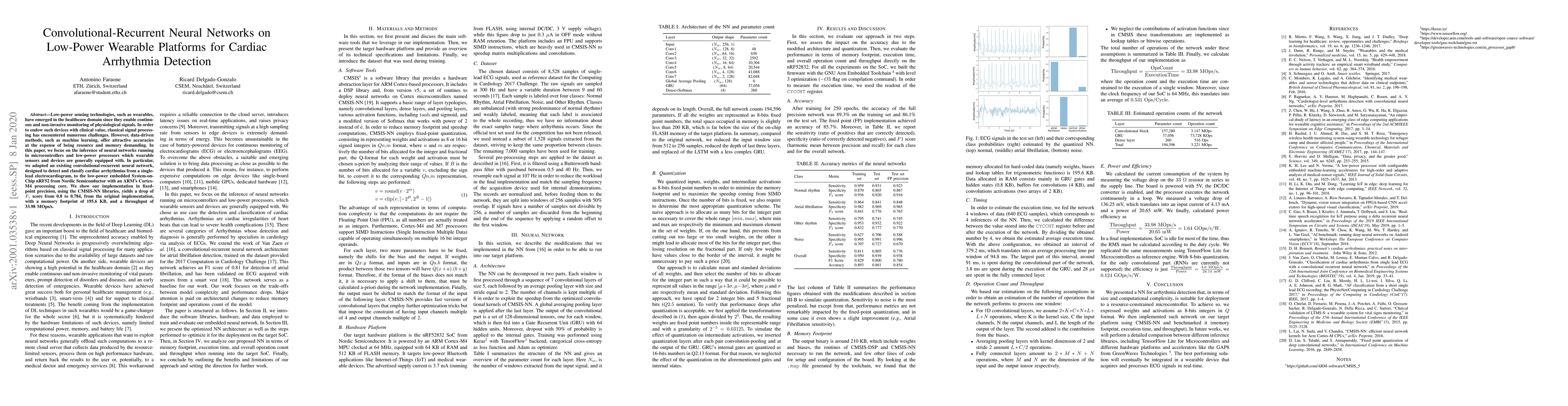 This paper adapts convolutional-recurrent neural networks for cardiac arrhythmia detection on low-power wearable devices, specifically the nRF52 microcontroller, achieving a $F_1$ score drop to 0.784 while maintaining a memory footprint of 195.6KB and a throughput of 33.98MOps/s. The implementation leverages fixed-point precision and CMSIS-NN libraries for efficient resource utilization.