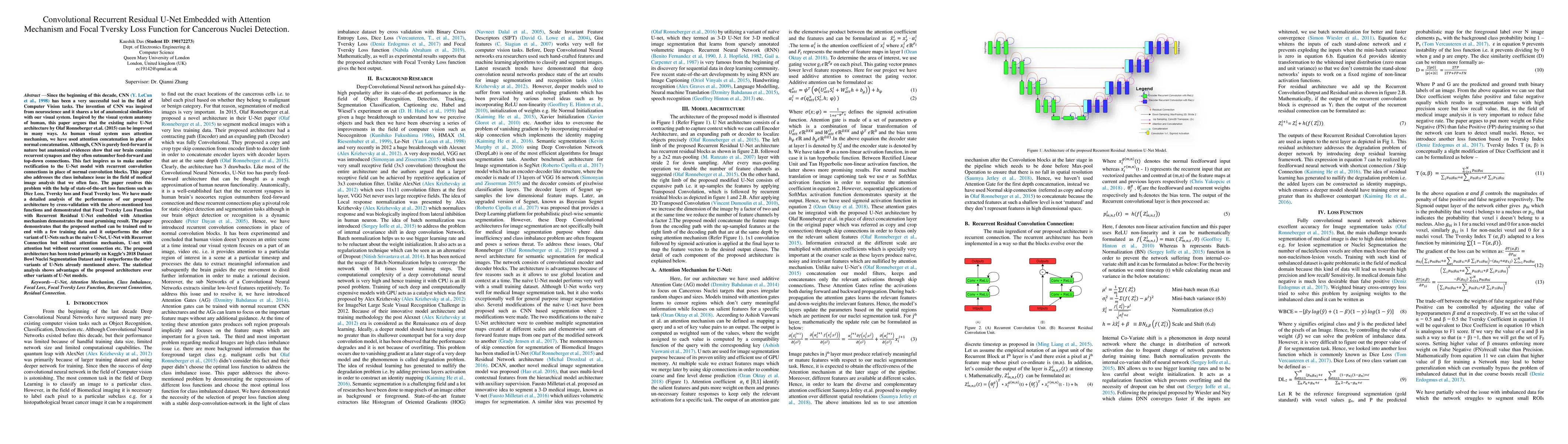 This paper proposes a new architecture for cancerous nuclei detection using a Convolutional Recurrent Residual U-Net with an attention mechanism, which outperforms traditional U-Net architectures and can be trained end-to-end with limited data.