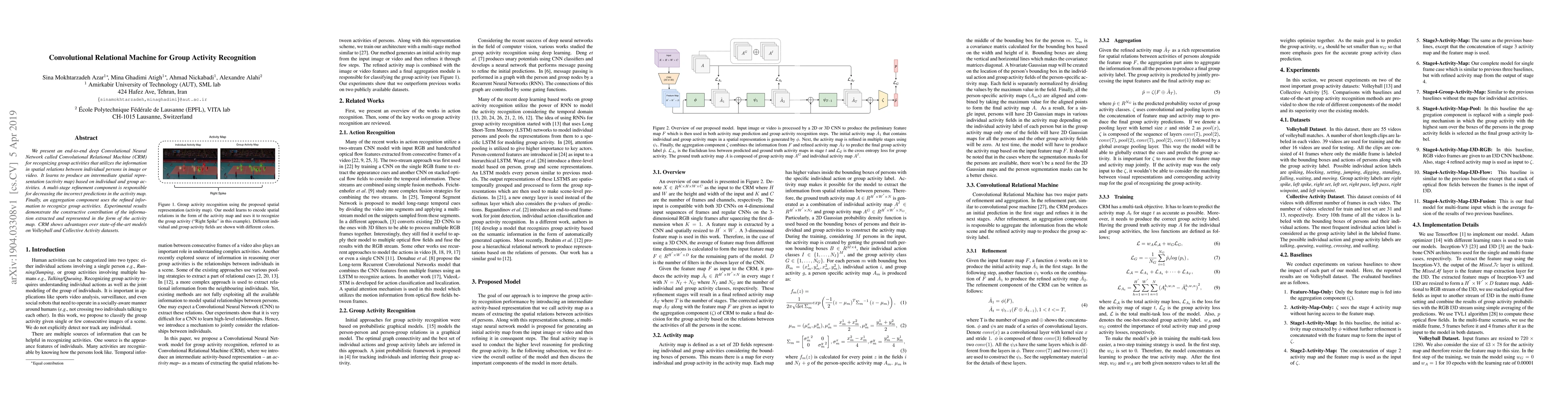 We present an end-to-end deep Convolutional Neural Network called Convolutional Relational Machine (CRM) for recognizing group activities that utilizes the information in spatial relations between individual persons in image or video. It learns to produce an intermediate spatial representation (activity map) based on individual and group activities. A multi-stage refinement component is responsible for decreasing the incorrect predictions in the activity map. Finally, an aggregation component uses the refined information to recognize group activities. Experimental results demonstrate the constructive contribution of the information extracted and represented in the form of the activity map. CRM shows advantages over state-of-the-art models on Volleyball and Collective Activity datasets.