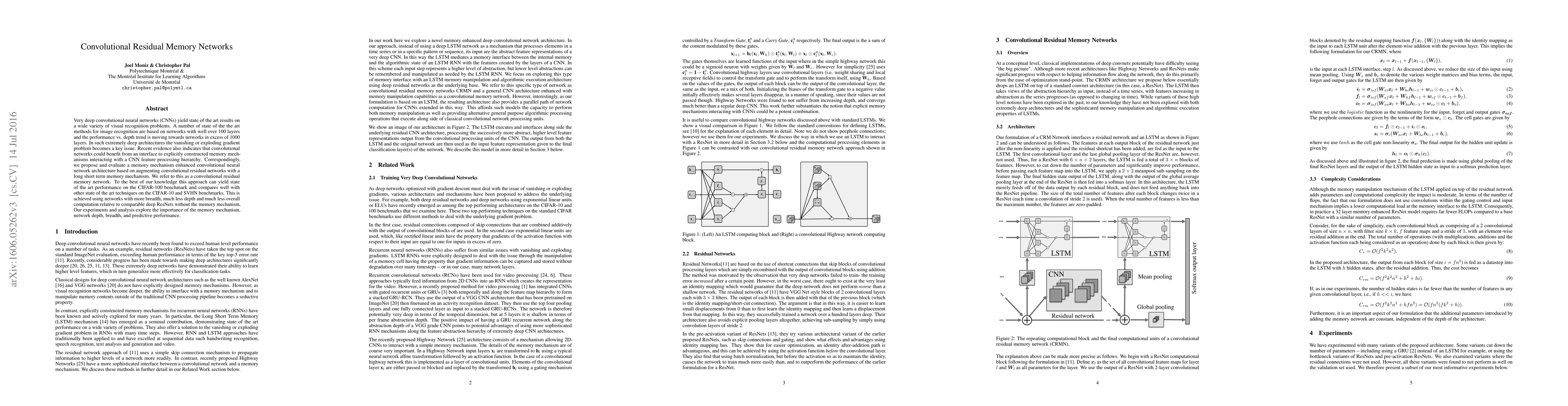 This research introduces convolutional residual memory networks, which combine convolutional residual networks with long short-term memory mechanisms to address the vanishing gradient problem in very deep networks. The proposed architecture achieves state-of-the-art performance on CIFAR-100 and compares favorably on CIFAR-10 and SVHN benchmarks, using less depth and computation compared to traditional deep residual networks.