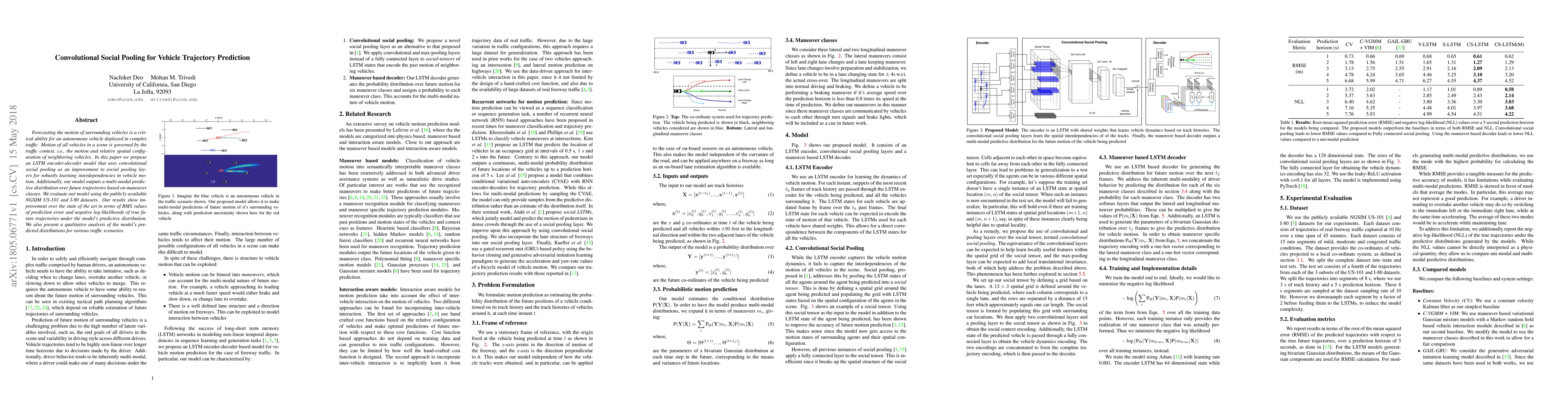 This paper proposes an LSTM encoder-decoder model with convolutional social pooling to improve vehicle trajectory prediction by learning interdependencies in vehicle motion. The model outputs a multi-modal predictive distribution and outperforms state-of-the-art methods on NGSIM US-101 and I-80 datasets.