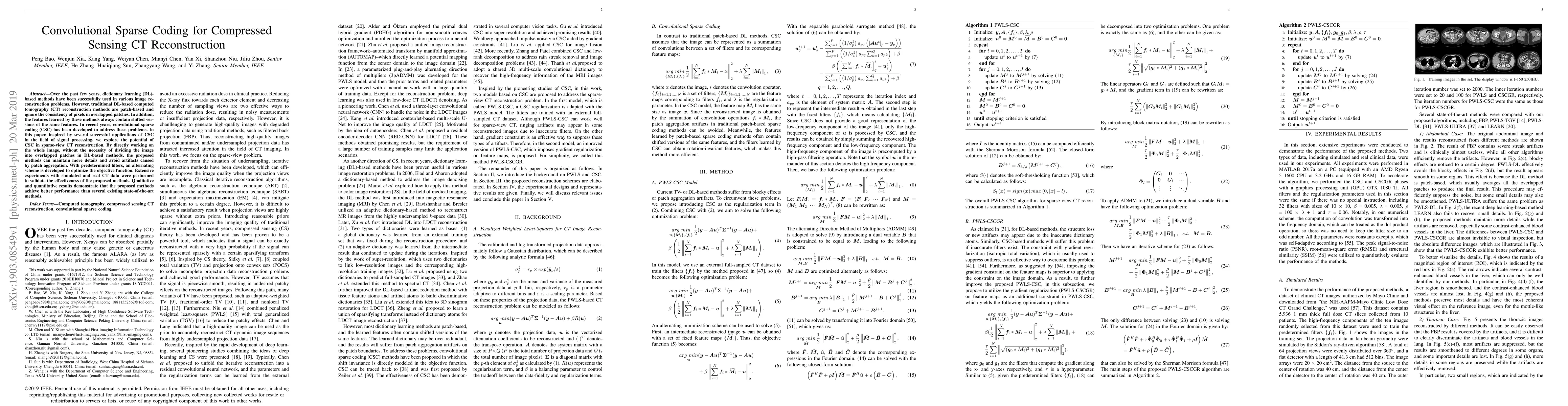 This paper proposes convolutional sparse coding (CSC) for compressed sensing CT reconstruction, addressing the limitations of traditional patch-based methods by working directly on the whole image to maintain details and avoid artifacts. The developed alternating optimization scheme with predetermined filters shows superior performance in both simulated and real CT data.