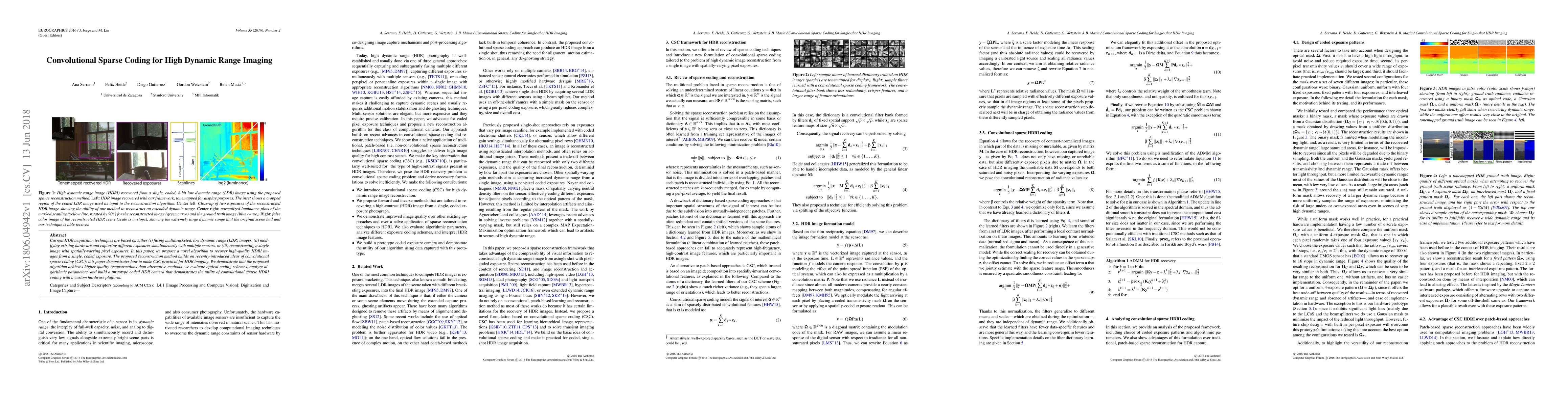This paper introduces a novel convolutional sparse coding algorithm for reconstructing high-quality high dynamic range images from a single coded exposure, demonstrating superior results compared to existing methods and building a prototype coded HDR camera to validate the approach.