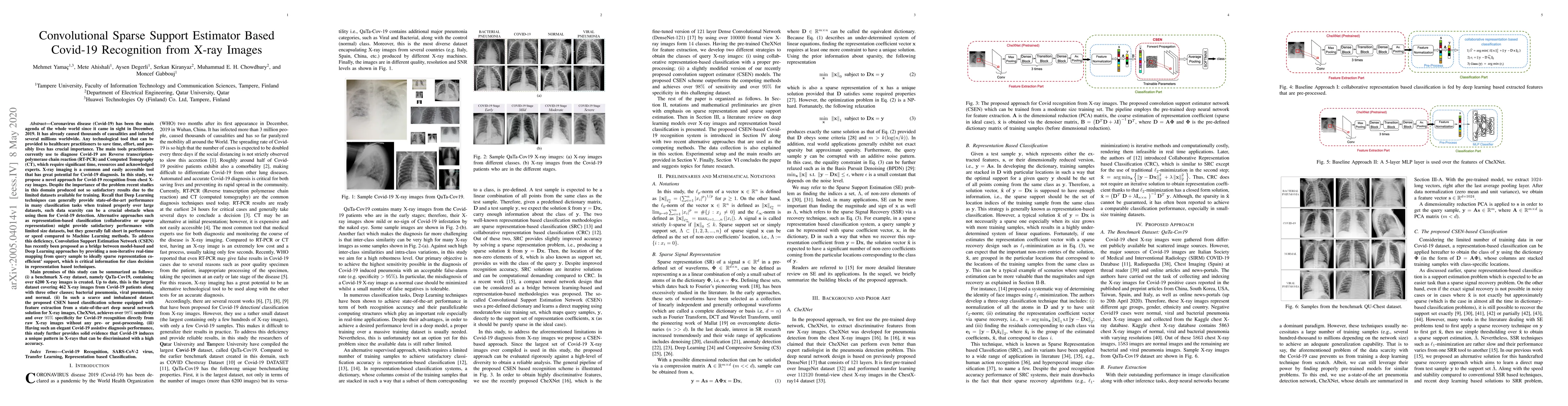 Coronavirus disease (Covid-19) has been the main agenda of the whole world since it came in sight in December 2019. It has already caused thousands of causalities and infected several millions worldwide. Any technological tool that can be provided to healthcare practitioners to save time, effort, and possibly lives has crucial importance. The main tools practitioners currently use to diagnose Covid-19 are Reverse Transcription-Polymerase Chain reaction (RT-PCR) and Computed Tomography (CT), which require significant time, resources and acknowledged experts. X-ray imaging is a common and easily accessible tool that has great potential for Covid-19 diagnosis. In this study, we propose a novel approach for Covid-19 recognition from chest X-ray images. Despite the importance of the problem, recent studies in this domain produced not so satisfactory results due to the limited datasets available for training. Recall that Deep Learning techniques can generally provide state-of-the-art performance in many classification tasks when trained properly over large datasets, such data scarcity can be a crucial obstacle when using them for Covid-19 detection. Alternative approaches such as representation-based classification (collaborative or sparse representation) might provide satisfactory performance with limited size datasets, but they generally fall short in performance or speed compared to Machine Learning methods. To address this deficiency, Convolution Support Estimation Network (CSEN) has recently been proposed as a bridge between model-based and Deep Learning approaches by providing a non-iterative real-time mapping from query sample to ideally sparse representation coefficient' support, which is critical information for class decision in representation based techniques.