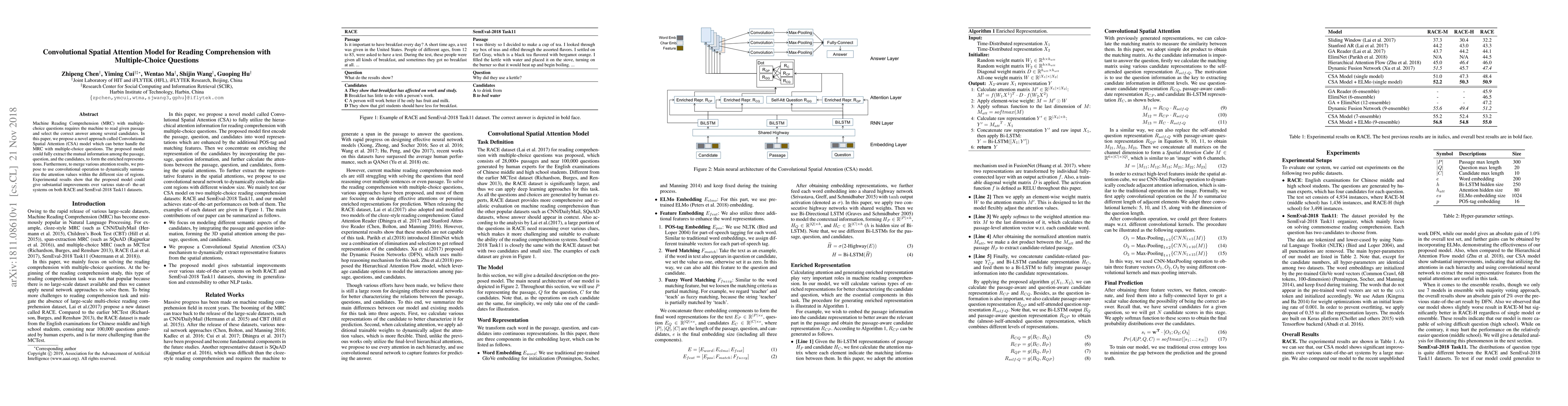 The paper proposes a Convolutional Spatial Attention (CSA) model to enhance machine reading comprehension for multiple-choice questions by extracting mutual information among passage, question, and candidates. The model uses convolutional operations to merge attention results, achieving substantial improvements over state-of-the-art systems on RACE and SemEval-2018 Task11 datasets.