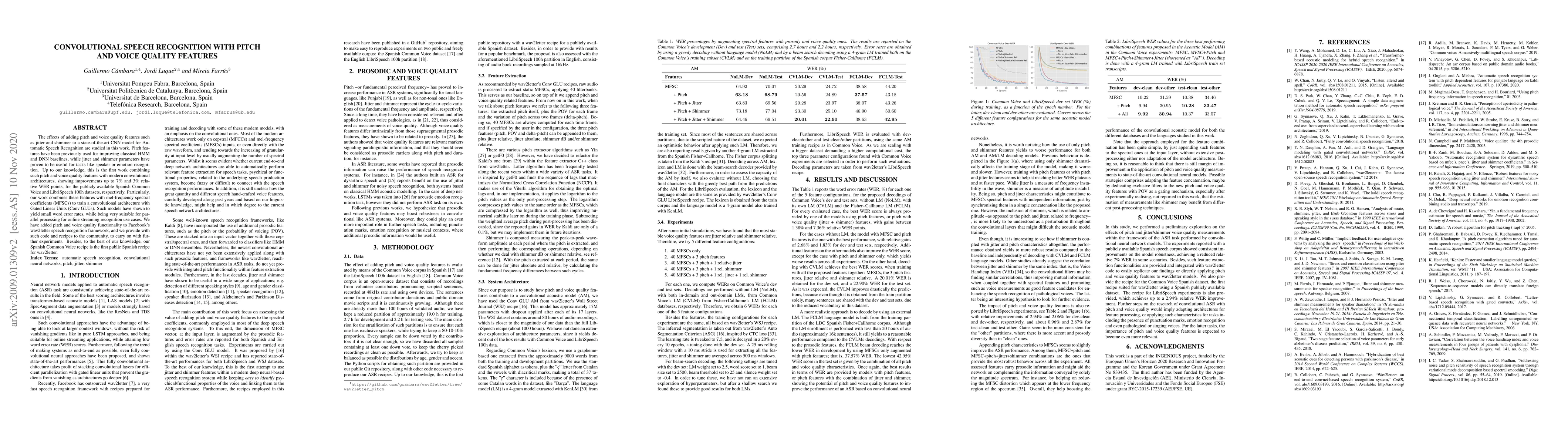 This paper investigates the integration of pitch and voice quality features like jitter and shimmer into a CNN model for Automatic Speech Recognition, achieving up to 7% and 3% relative improvements in word error rates on the Spanish Common Voice and LibriSpeech datasets, respectively. The study combines these features with mel-frequency spectral coefficients and Gated Linear Units, contributing to the wav2letter framework and providing open-source code for further research.