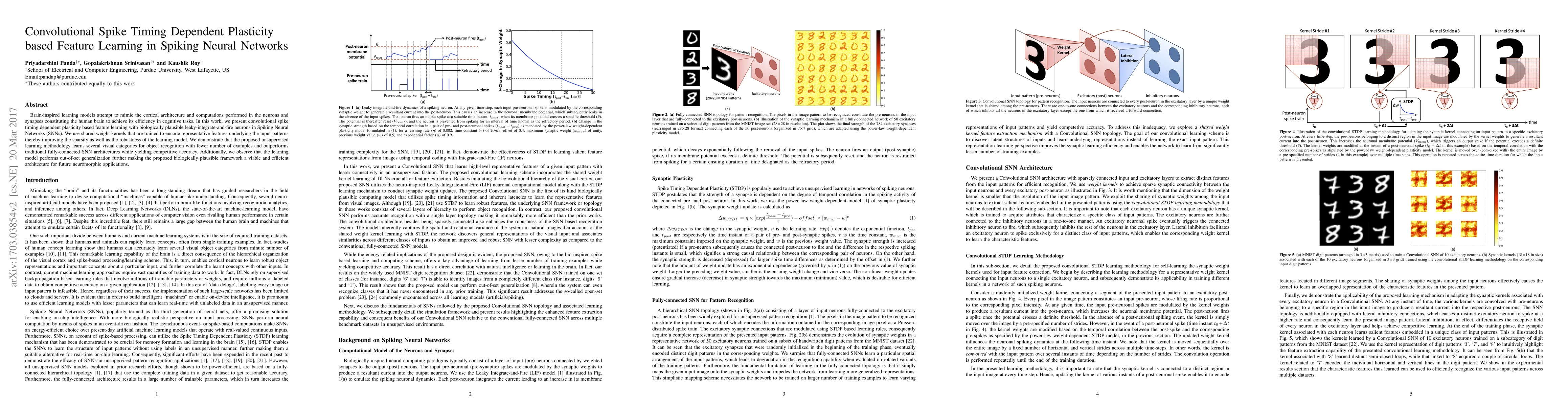 Brain-inspired learning models attempt to mimic the cortical architecture and computations performed in the neurons and synapses constituting the human brain to achieve its efficiency in cognitive tasks. In this work, we present convolutional spike timing dependent plasticity based feature learning with biologically plausible leaky-integrate-and-fire neurons in Spiking Neural Networks (SNNs). We use shared weight kernels that are trained to encode representative features underlying the input patterns thereby improving the sparsity as well as the robustness of the learning model. We demonstrate that the proposed unsupervised learning methodology learns several visual categories for object recognition with fewer number of examples and outperforms traditional fully-connected SNN architectures while yielding competitive accuracy. Additionally, we observe that the learning model performs out-of-set generalization further making the proposed biologically plausible framework a viable and efficient architecture for future neuromorphic applications.