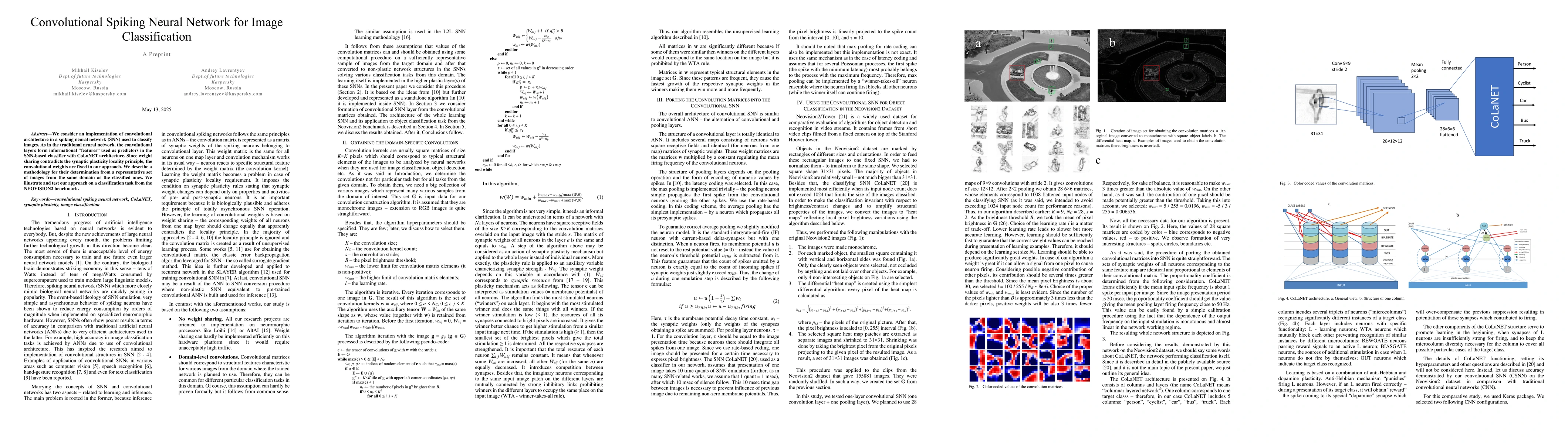 The research implements a convolutional architecture in a spiking neural network (SNN) for image classification, using CoLaNET architecture. Convolutional weights are fixed, determined from a representative set of images from the same domain as the classified ones.