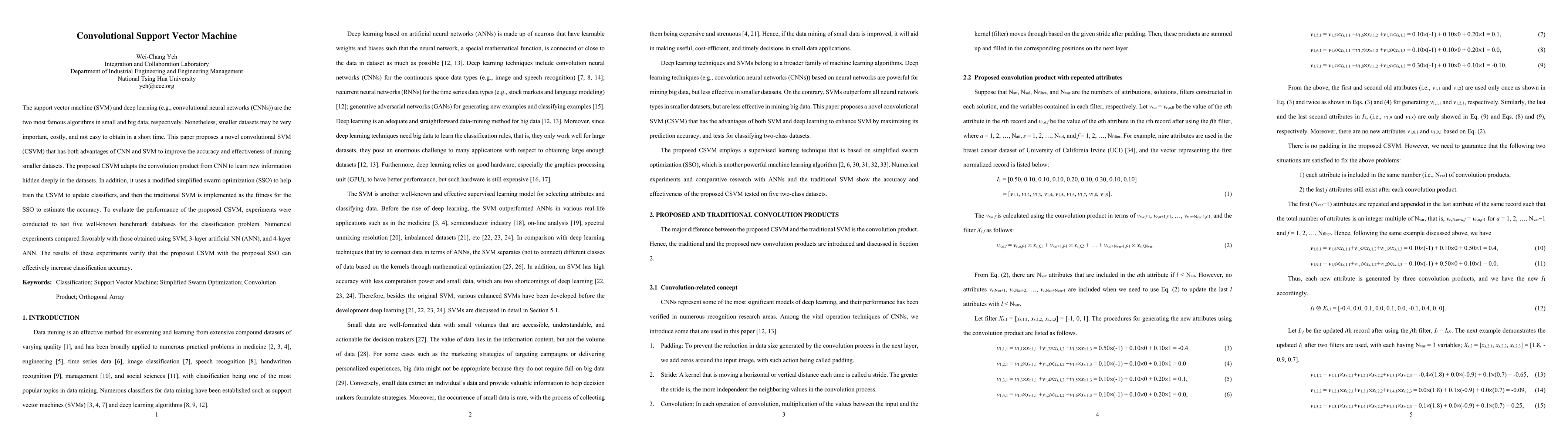 The support vector machine (SVM) and deep learning (e.g., convolutional neural networks (CNNs)) are the two most famous algorithms in small and big data, respectively. Nonetheless, smaller datasets may be very important, costly, and not easy to obtain in a short time. This paper proposes a novel convolutional SVM (CSVM) that has both advantages of CNN and SVM to improve the accuracy and effectiveness of mining smaller datasets. The proposed CSVM adapts the convolution product from CNN to learn new information hidden deeply in the datasets. In addition, it uses a modified simplified swarm optimization (SSO) to help train the CSVM to update classifiers, and then the traditional SVM is implemented as the fitness for the SSO to estimate the accuracy. To evaluate the performance of the proposed CSVM, experiments were conducted to test five well-known benchmark databases for the classification problem. Numerical experiments compared favorably with those obtained using SVM, 3-layer artificial NN (ANN), and 4-layer ANN. The results of these experiments verify that the proposed CSVM with the proposed SSO can effectively increase classification accuracy.