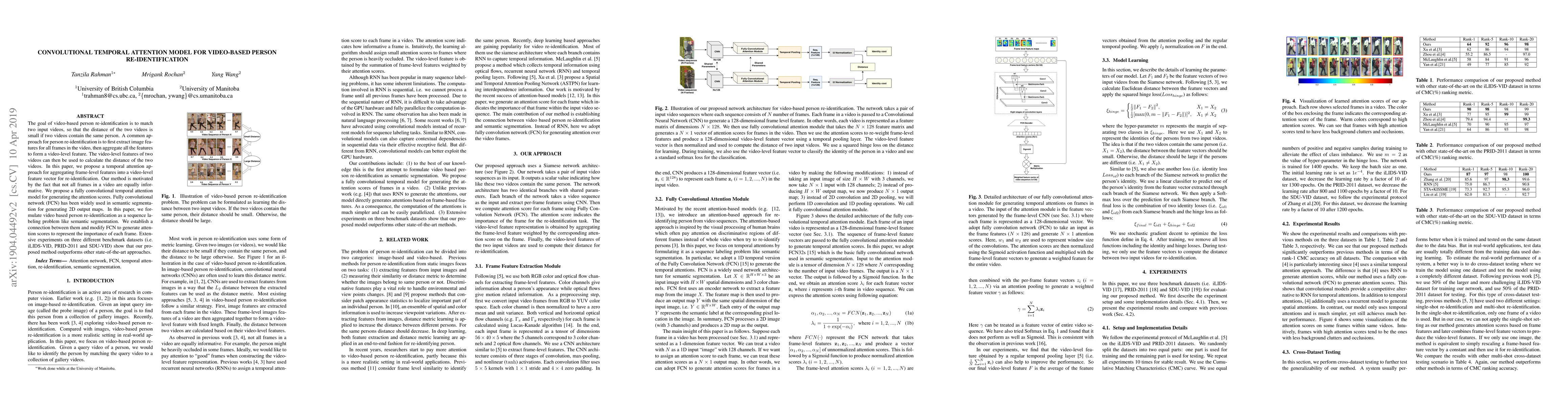 This paper proposes a convolutional temporal attention model for video-based person re-identification, utilizing a fully convolutional network to generate attention scores that highlight the importance of each frame, thereby improving the aggregation of frame-level features into a more effective video-level feature vector. Experimental results show superior performance compared to other state-of-the-art methods on three benchmark datasets.
