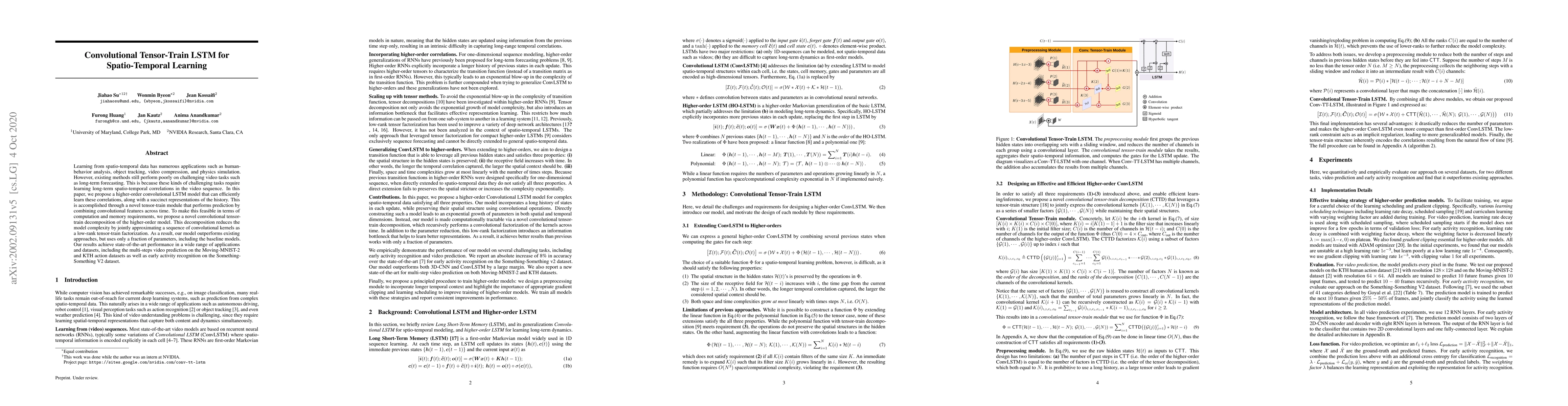 Learning from spatio-temporal data has numerous applications such as human-behavior analysis, object tracking, video compression, and physics simulation.However, existing methods still perform poorly on challenging video tasks such as long-term forecasting. This is because these kinds of challenging tasks require learning long-term spatio-temporal correlations in the video sequence. In this paper, we propose a higher-order convolutional LSTM model that can efficiently learn these correlations, along with a succinct representations of the history. This is accomplished through a novel tensor train module that performs prediction by combining convolutional features across time. To make this feasible in terms of computation and memory requirements, we propose a novel convolutional tensor-train decomposition of the higher-order model. This decomposition reduces the model complexity by jointly approximating a sequence of convolutional kernels asa low-rank tensor-train factorization. As a result, our model outperforms existing approaches, but uses only a fraction of parameters, including the baseline models.Our results achieve state-of-the-art performance in a wide range of applications and datasets, including the multi-steps video prediction on the Moving-MNIST-2and KTH action datasets as well as early activity recognition on the Something-Something V2 dataset.