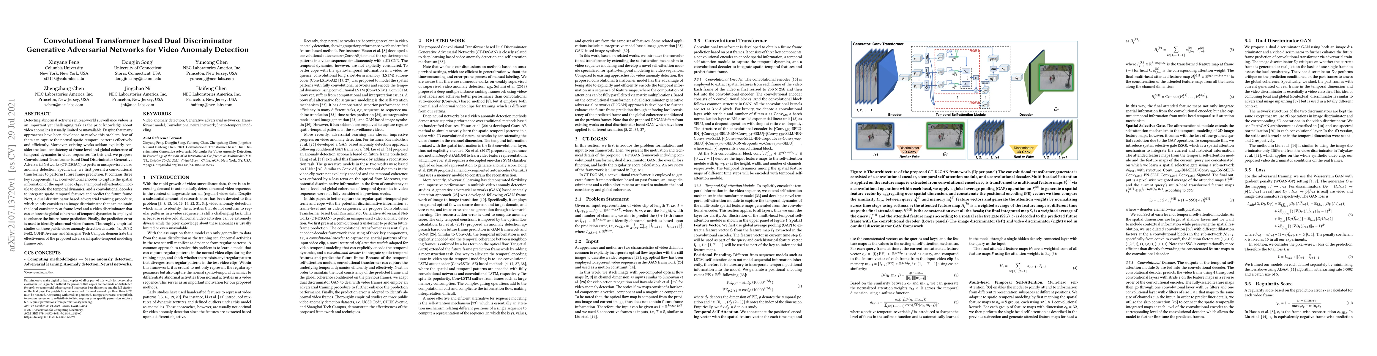 This paper proposes a Convolutional Transformer based Dual Discriminator Generative Adversarial Network (CT-D2GAN) for unsupervised video anomaly detection. It employs a convolutional transformer for future frame prediction and a dual discriminator for maintaining local frame-level consistency and global temporal coherence, demonstrating effectiveness on three public datasets.