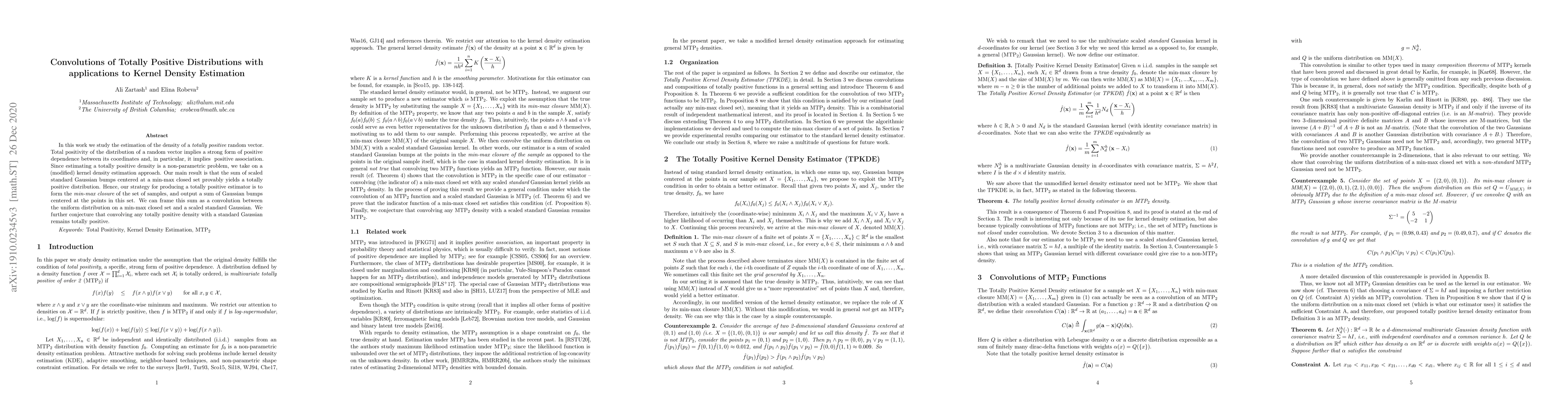 This paper explores the estimation of densities for totally positive random vectors using a modified kernel density estimation approach. The authors demonstrate that convolving a uniform distribution on a min-max closed set with a scaled standard Gaussian yields a totally positive distribution, providing a new method for constructing such estimators.