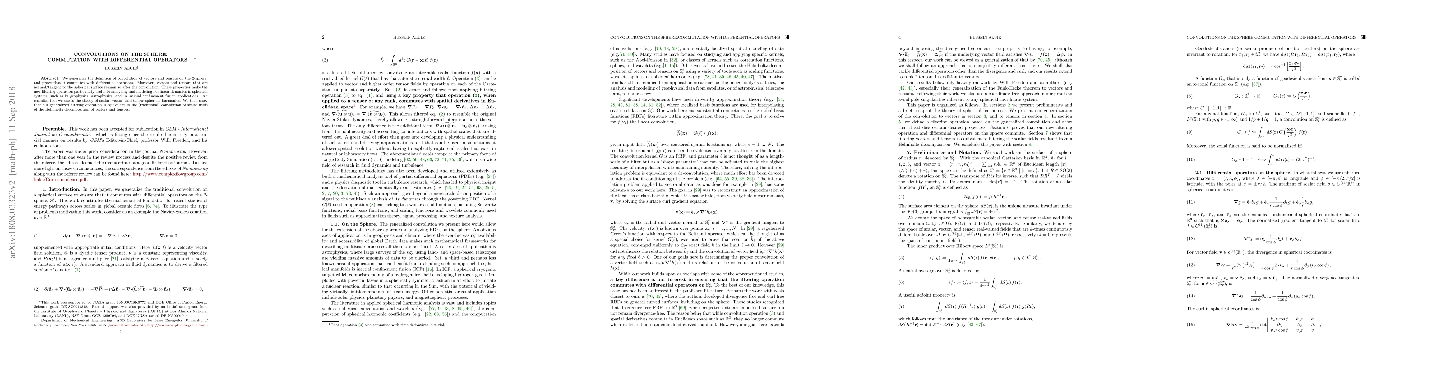 We generalize the definition of convolution of vectors and tensors on the 2-sphere, and prove that it commutes with differential operators. Moreover, vectors and tensors that are normal/tangent to the spherical surface remain so after the convolution. These properties make the new filtering operation particularly useful to analyzing and modeling nonlinear dynamics in spherical systems, such as in geophysics, astrophysics, and in inertial confinement fusion applications. An essential tool we use is the theory of scalar, vector, and tensor spherical harmonics. We then show that our generalized filtering operation is equivalent to the (traditional) convolution of scalar fields of the Helmholtz decomposition of vectors and tensors.