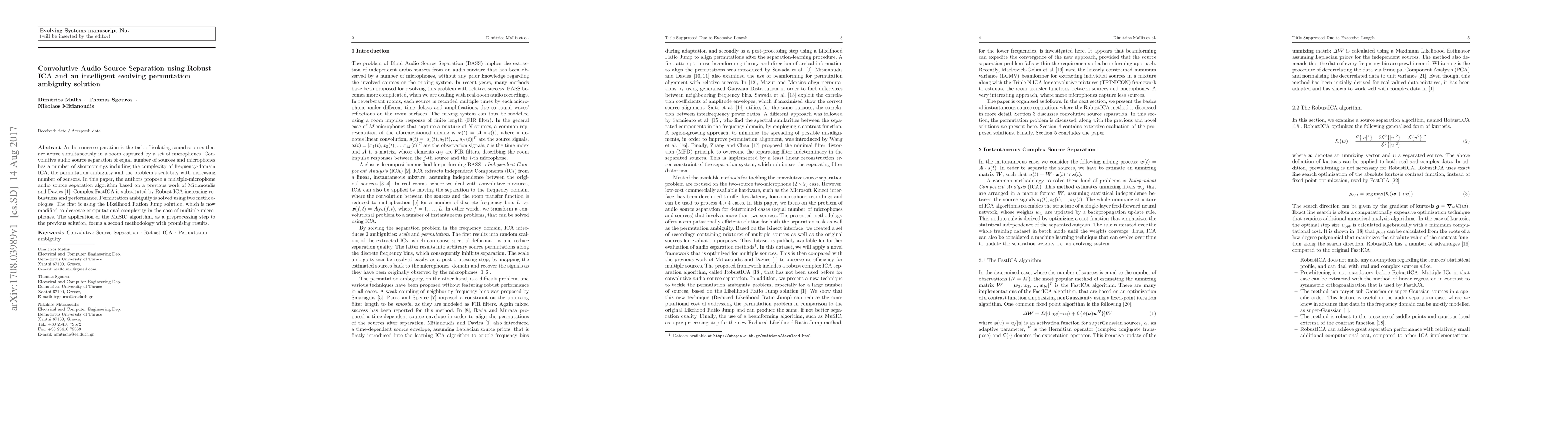 This paper proposes an advanced algorithm for convolative audio source separation using Robust ICA to enhance performance and tackle permutation ambiguity through a modified Likelihood Ratio Jump solution and the MuSIC algorithm, addressing scalability and complexity issues in multiple microphone setups.