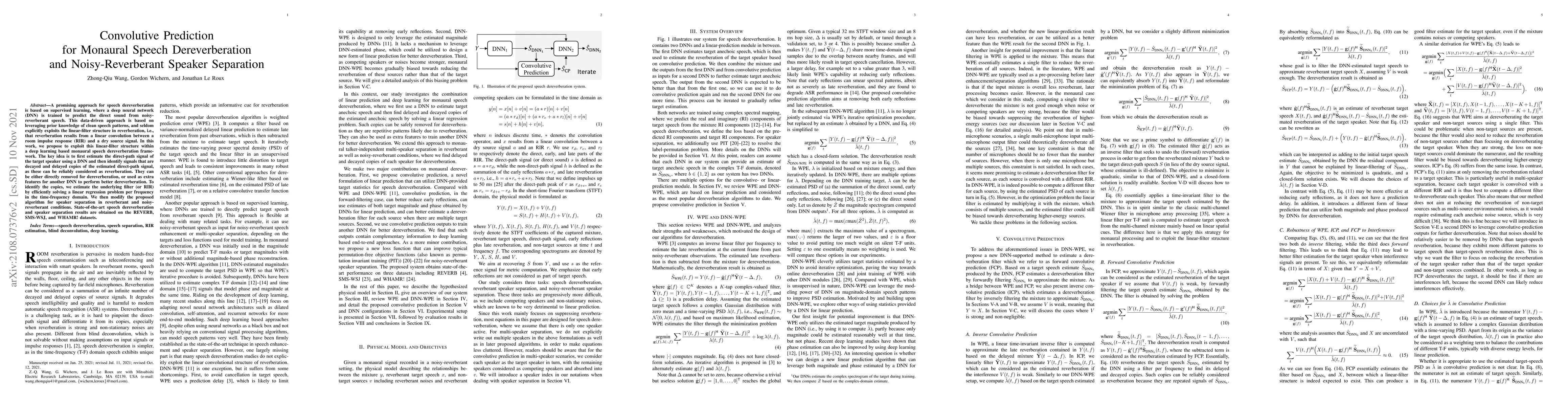 This paper proposes a deep learning framework for monaural speech dereverberation and speaker separation by leveraging the linear convolution structure of reverberation. The approach estimates direct-path signals and identifies reverberation as delayed copies, achieving state-of-the-art performance on multiple datasets.