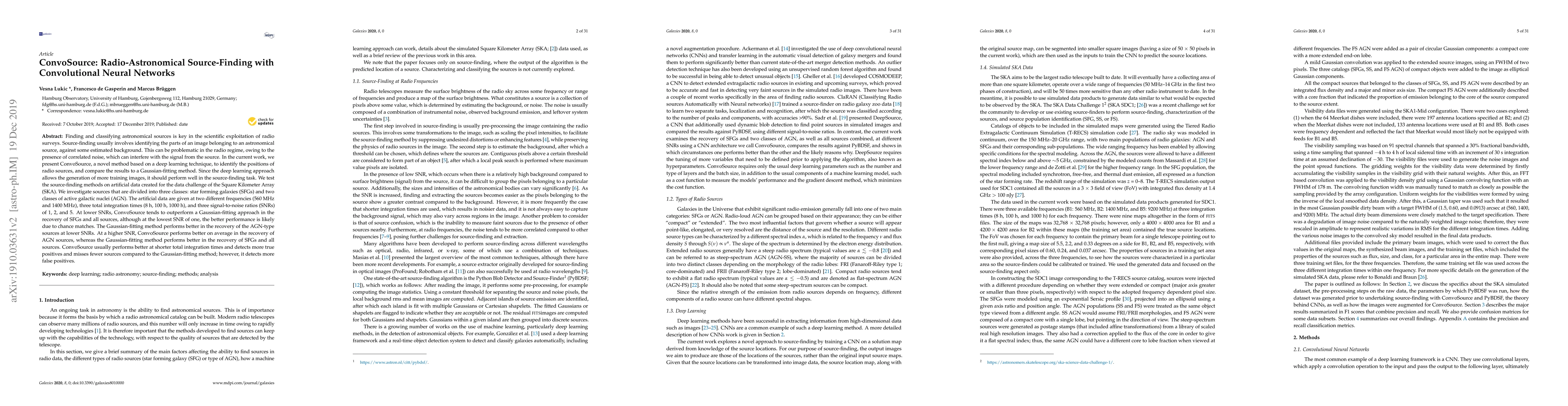 ConvoSource employs convolutional neural networks to identify radio astronomical sources, outperforming traditional Gaussian-fitting methods, especially at lower signal-to-noise ratios, while detecting more true positives but also more false positives.