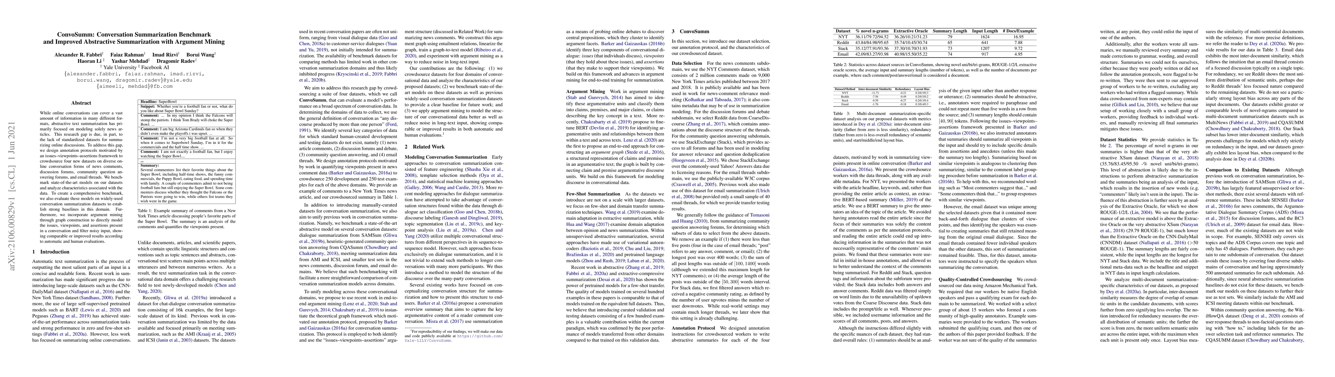 The paper introduces ConvoSumm, a new benchmark for abstractive summarization of diverse online conversations, including news comments and discussion forums. It evaluates state-of-the-art models on four newly created datasets and integrates argument mining to improve summarization quality through better modeling of conversation structures.