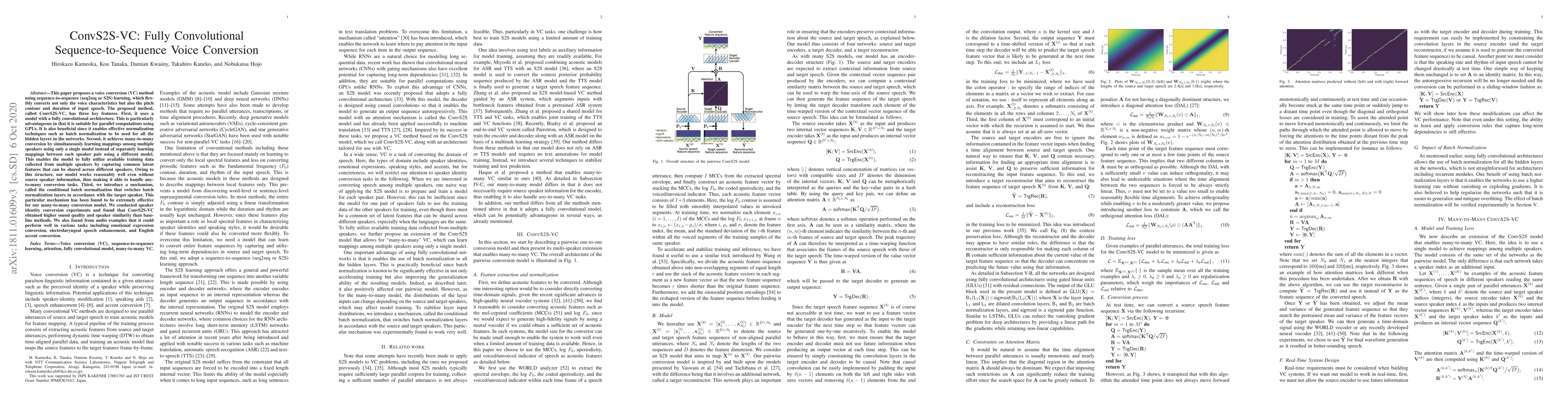 The paper introduces ConvS2S-VC, a fully convolutional sequence-to-sequence voice conversion method that converts voice characteristics, pitch contour, and duration. It features a GPU-friendly architecture, many-to-many conversion using a single model, and conditional batch normalization for effective speaker mapping.