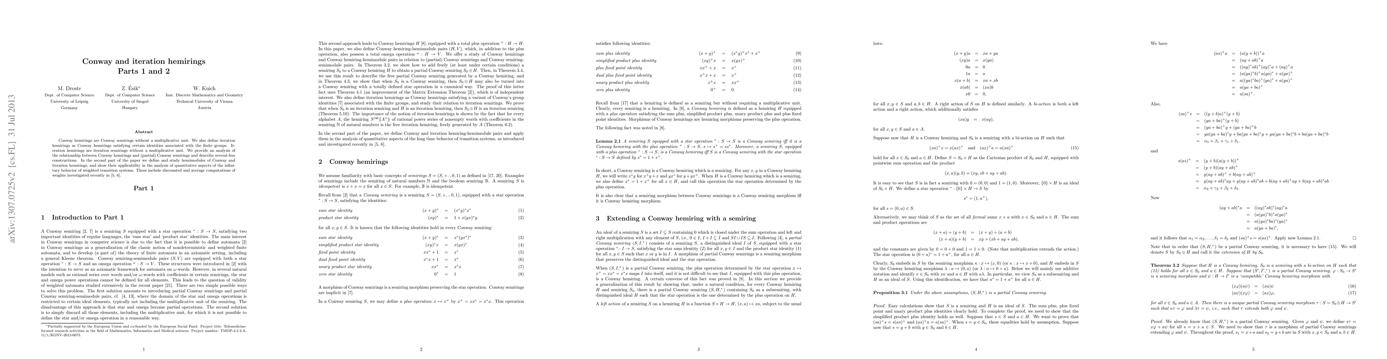 Researchers explore Conway hemirings, which are semirings without a multiplicative unit, and iteration hemirings that satisfy certain group identities. They provide analysis tools for these structures, including free constructions and hemimodules, with applications in weighted transition systems.