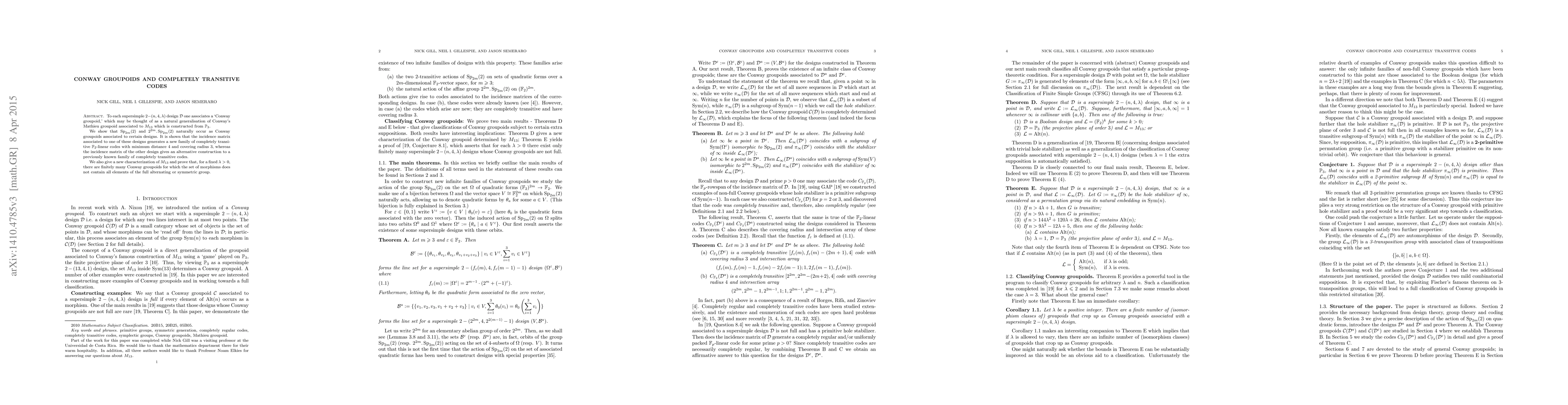 To each supersimple $2-(n,4,\lambda)$ design $\mathcal{D}$ one associates a `Conway groupoid,' which may be thought of as a natural generalisation of Conway's Mathieu groupoid associated to $M_{13}$ which is constructed from $\mathbb{P}_3$. We show that $\operatorname{Sp}_{2m}(2)$ and $2^{2m}.\operatorname{Sp}_{2m}(2)$ naturally occur as Conway groupoids associated to certain designs. It is shown that the incidence matrix associated to one of these designs generates a new family of completely transitive $\mathbb{F}_2$-linear codes with minimum distance 4 and covering radius 3, whereas the incidence matrix of the other design gives an alternative construction to a previously known family of completely transitive codes. We also give a new characterization of $M_{13}$ and prove that, for a fixed $\lambda > 0,$ there are finitely many Conway groupoids for which the set of morphisms does not contain all elements of the full alternating or symmetric group.