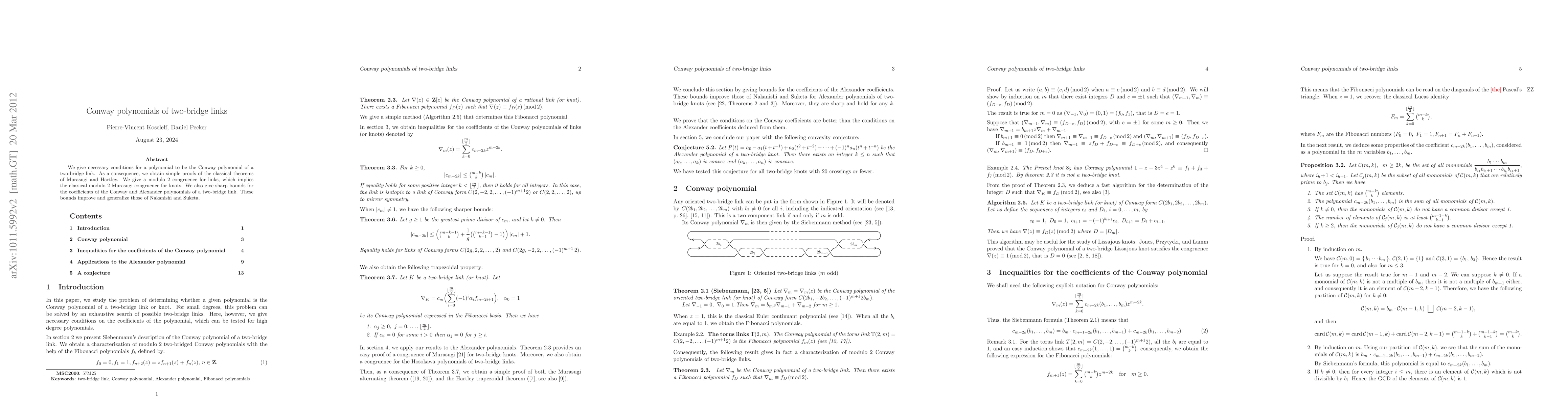 This paper provides necessary conditions for a polynomial to be the Conway polynomial of a two-bridge link, offering proofs of Murasugi and Hartley's classical theorems. It also introduces a modulo 2 congruence for links and improves bounds for coefficients in Conway and Alexander polynomials.