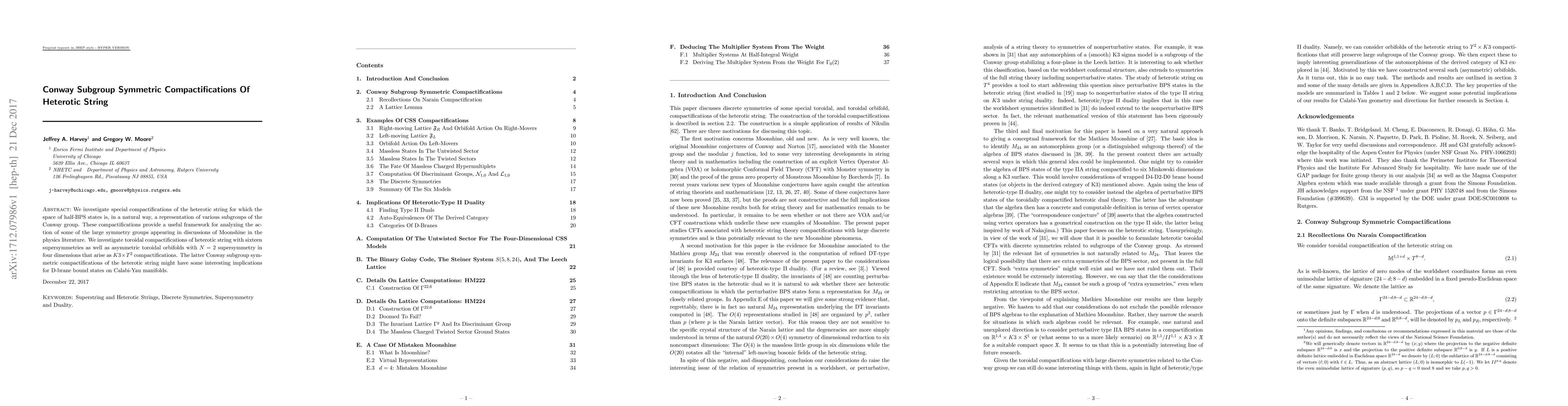 This paper explores compactifications of the heterotic string where the space of half-BPS states represents subgroups of the Conway group, providing a framework to analyze large symmetry groups linked to Moonshine. It focuses on toroidal and asymmetric toroidal orbifold compactifications, particularly those involving $K3 \times T^2$ structures, which may influence D-brane bound states on Calabi-Yau manifolds.