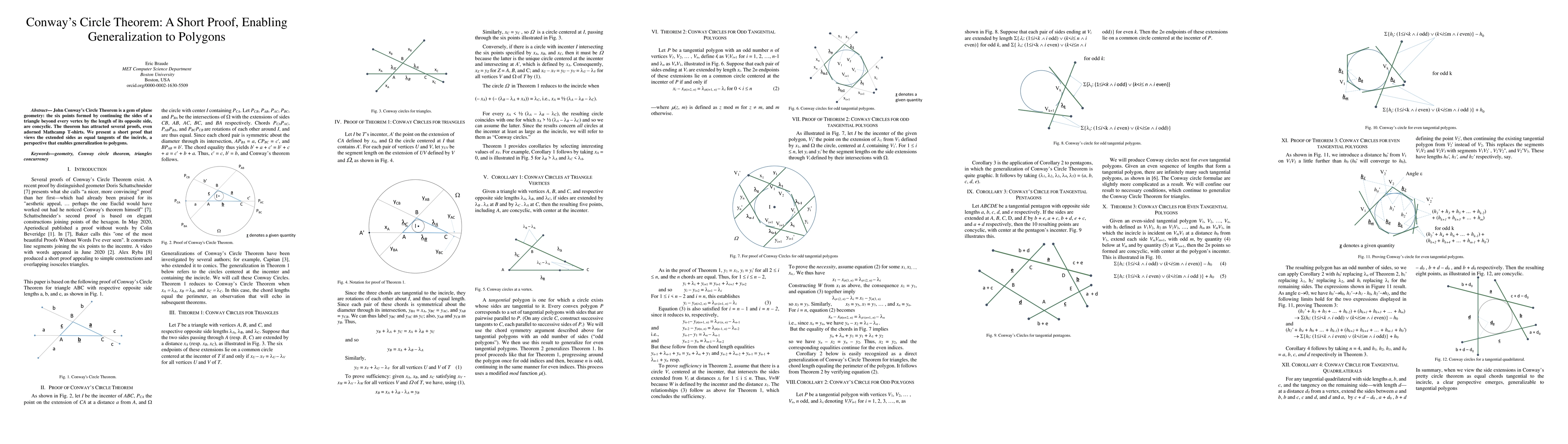 John Conway's Circle Theorem is a gem of plane geometry. The six points formed by continuing the sides of a triangle beyond every vertex by the length of its opposite side, are concyclic. The theorem has attracted several proofs. We present a short proof that views the extended sides as equal tangents of the incircle, a perspective that enables generalization to polygons.