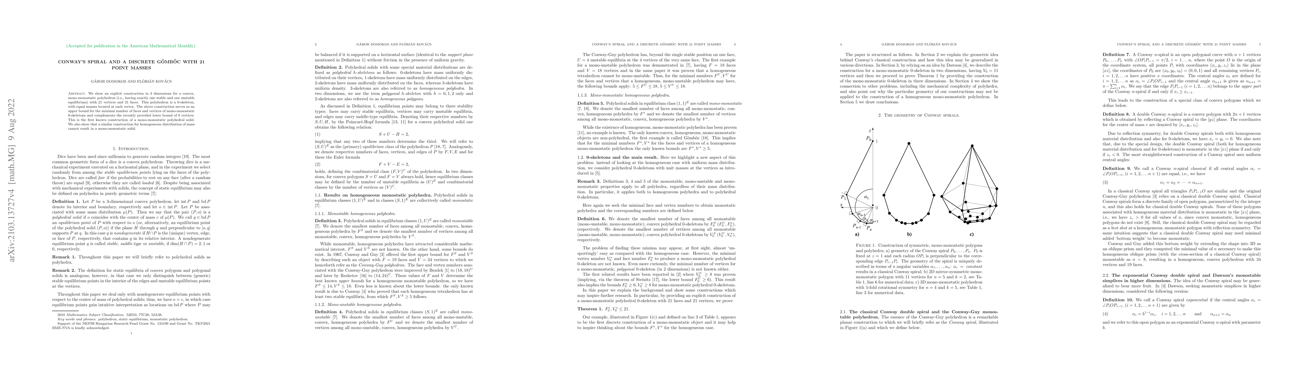 We show an explicit construction in 3 dimensions for a convex, mono-monostatic polyhedron (i.e., having exactly one stable and one unstable equilibrium) with 21 vertices and 21 faces. This polyhedron is a 0-skeleton, with equal masses located at each vertex. The above construction serves as an upper bound for the minimal number of faces and vertices of mono-monostatic 0-skeletons and complements the recently provided lower bound of 8 vertices. This is the first known construction of a mono-monostatic polyhedral solid. We also show that a similar construction for homogeneous distribution of mass cannot result in a mono-monostatic solid.