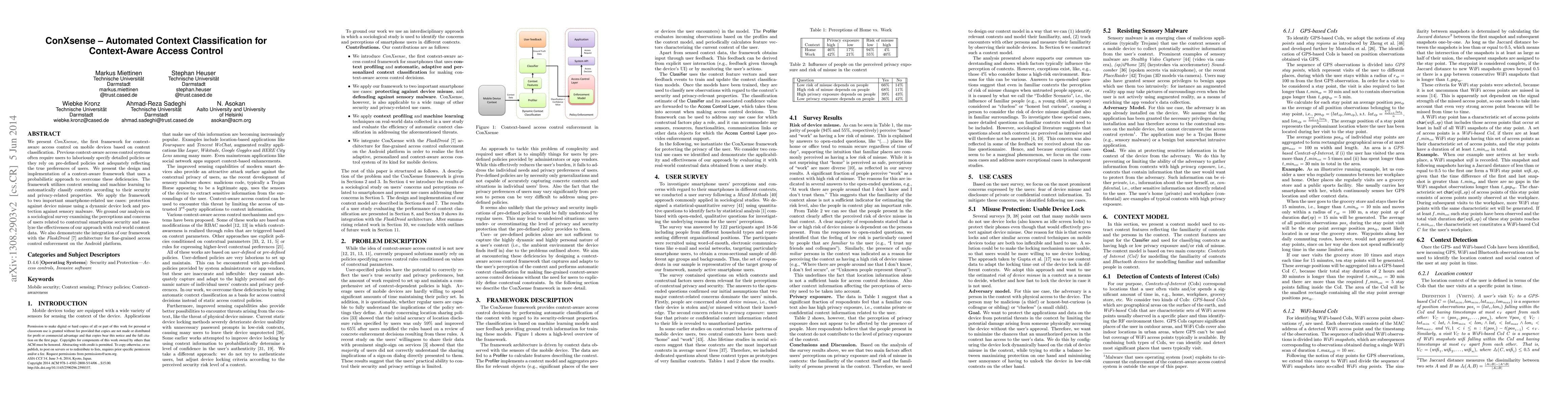 ConXsense is a novel framework for automated context-aware access control on mobile devices, employing machine learning for context classification to enhance security and privacy. The framework dynamically adjusts access control based on real-world context data, improving upon traditional methods that rely on user-specified policies or pre-defined rules.