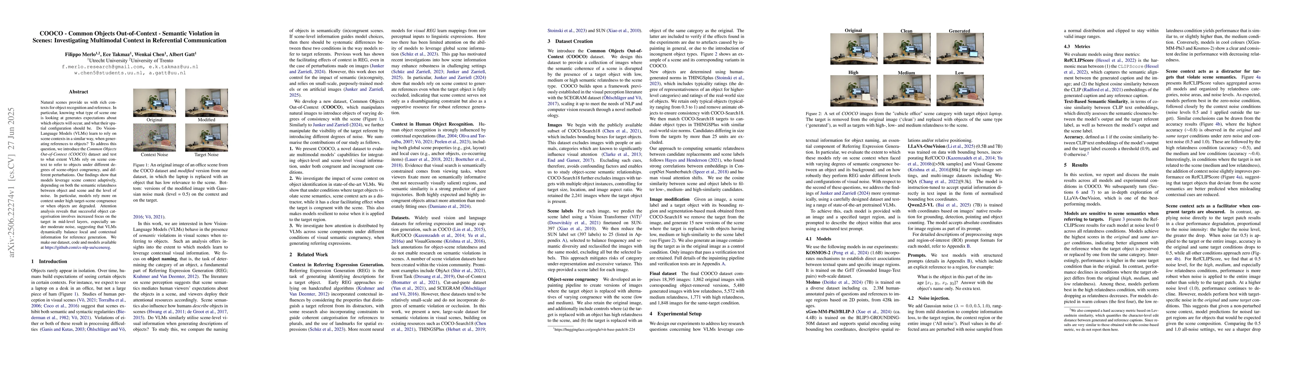 Natural scenes provide us with rich contexts for object recognition and reference. In particular, knowing what type of scene one is looking at generates expectations about which objects will occur, and what their spatial configuration should be. Do Vision-Language Models (VLMs) learn to rely on scene contexts in a similar way, when generating references to objects? To address this question, we introduce the \textit{Common Objects Out-of-Context (COOCO)} dataset and test to what extent VLMs rely on scene context to refer to objects under different degrees of scene-object congruency, and different perturbations. Our findings show that models leverage scene context adaptively, depending on both the semantic relatedness between object and scene and the level of noise. In particular, models rely more on context under high target-scene congruence or when objects are degraded. Attention analysis reveals that successful object categorisation involves increased focus on the target in mid-level layers, especially under moderate noise, suggesting that VLMs dynamically balance local and contextual information for reference generation. We make our dataset, code and models available at \href{https://github.com/cs-nlp-uu/scenereg}{https://github.com/cs-nlp-uu/scenereg}.