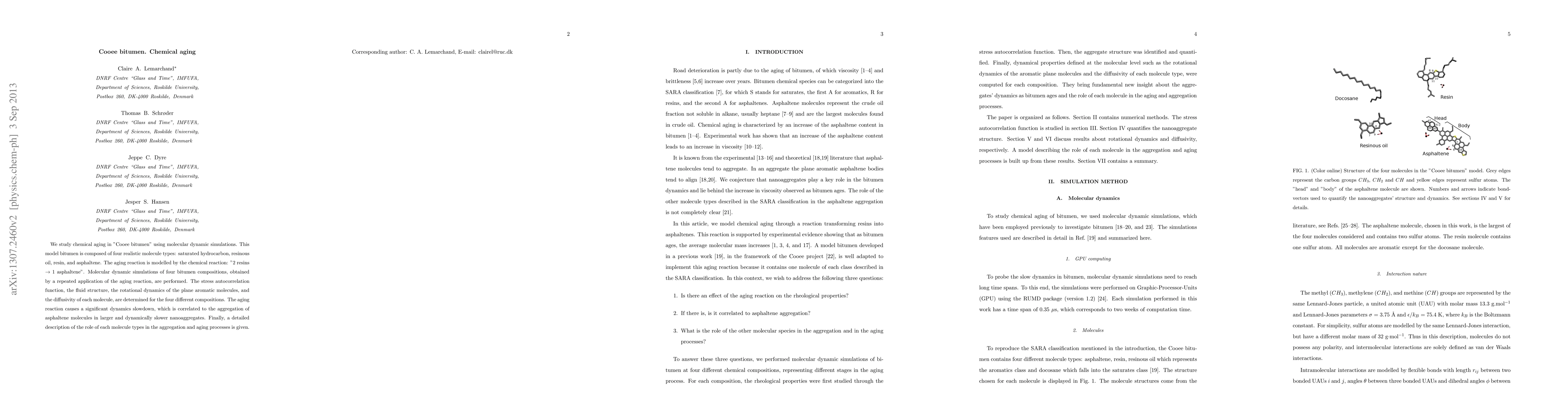 Researchers simulated chemical aging in a model bitumen composed of different molecule types using molecular dynamic simulations. The study found that the aging reaction causes a significant slowdown in dynamics, leading to aggregation of asphaltene molecules into larger, slower nanoaggregates.