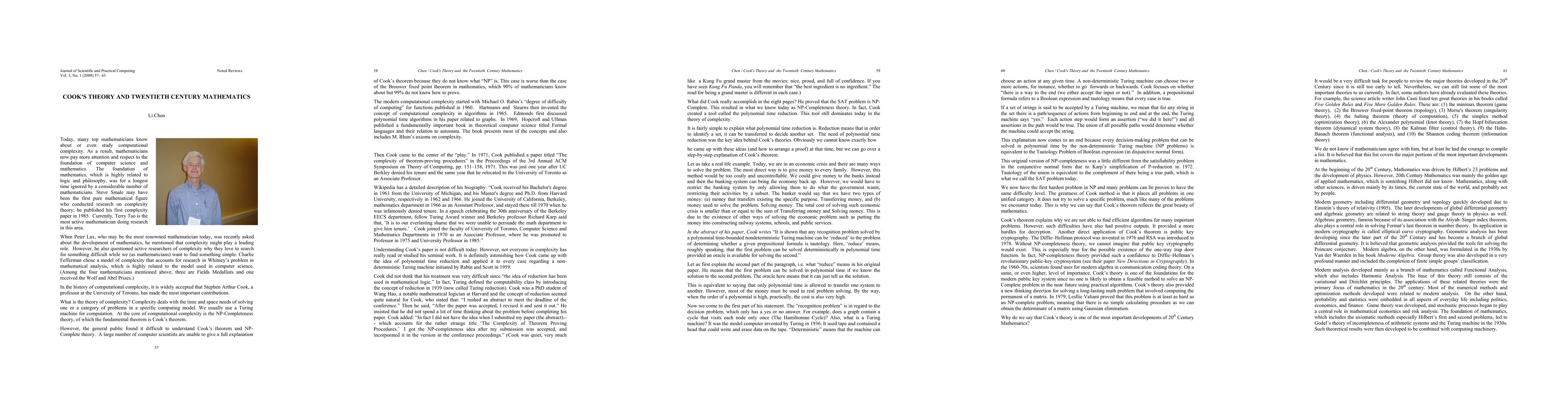 Summary: Cook's theory on NP-completeness revolutionized computational complexity, establishing a foundational framework for understanding difficult problems. This paper reviews Cook's seminal contributions and their profound impact on modern mathematical and computational research.