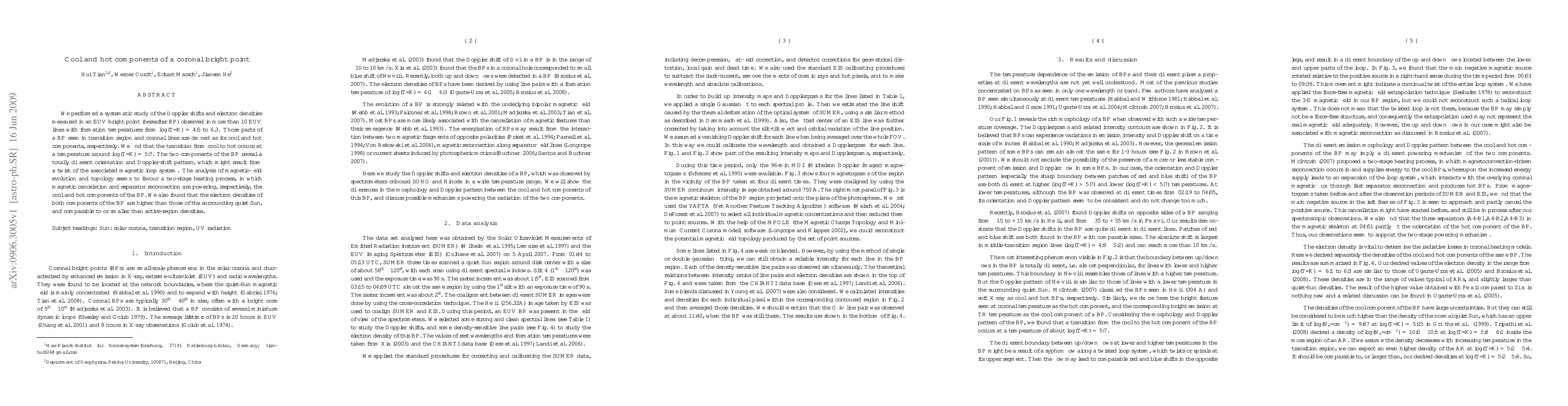 We performed a systematic study of the Doppler shifts and electron densities measured in an EUV bright point (hereafter BP) observed in more than 10 EUV lines with formation temperatures from log (T/K) p 4.5 to 6.3. Those parts of a BP seen in transition region and coronal lines are defined as its cool and hot components, respectively. We find that the transition from cool to hot occurs at a temperature around log (T/K) p 5.7. The two components of the BP reveal a totally different orientation and Doppler-shift pattern, which might result from a twist of the associated magnetic loop system. The analysis of magnetic field evolution and topology seems to favor a two-stage heating process, in which magnetic cancellation and separator reconnection are powering, respectively, the cool and hot components of the BP. We also found that the electron densities of both components of the BP are higher than those of the surrounding quiet Sun, and comparable to or smaller than active region densities.