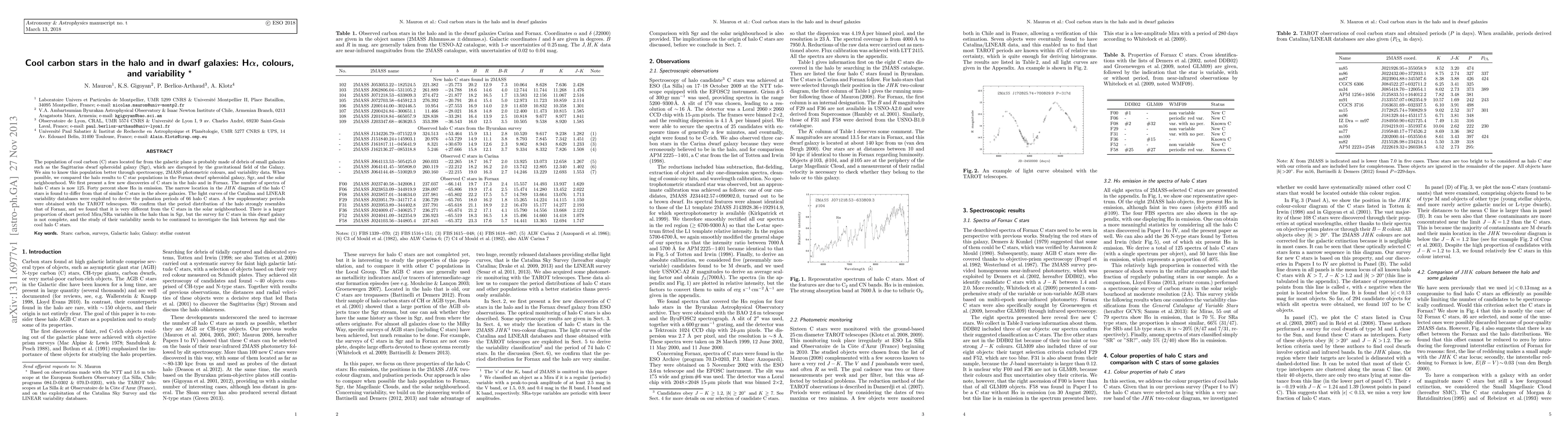 The population of cool carbon (C) stars located far from the galactic plane is probably made of debris of small galaxies such as the Sagittarius dwarf spheroidal galaxy (Sgr), which are disrupted by the gravitational field of the Galaxy. We aim to know this population better through spectroscopy, 2MASS photometric colours, and variability data. When possible, we compared the halo results to C star populations in the Fornax dwarf spheroidal galaxy, Sgr, and the solar neighbourhood. We first present a few new discoveries of C stars in the halo and in Fornax. The number of spectra of halo C stars is now 125. Forty percent show Halpha in emission. The narrow location in the JHK diagram of the halo C stars is found to differ from that of similar C stars in the above galaxies. The light curves of the Catalina and LINEAR variability databases were exploited to derive the pulsation periods of 66 halo C stars. A few supplementary periods were obtained with the TAROT telescopes. We confirm that the period distribution of the halo strongly resembles that of Fornax, and we found that is it very different from the C stars in the solar neighbourhood. There is a larger proportion of short period Mira/SRa variables in the halo than in Sgr, but the survey for C stars in this dwarf galaxy is not complete, and the study of their variability needs to be continued to investigate the link between Sgr and the cool halo C stars.