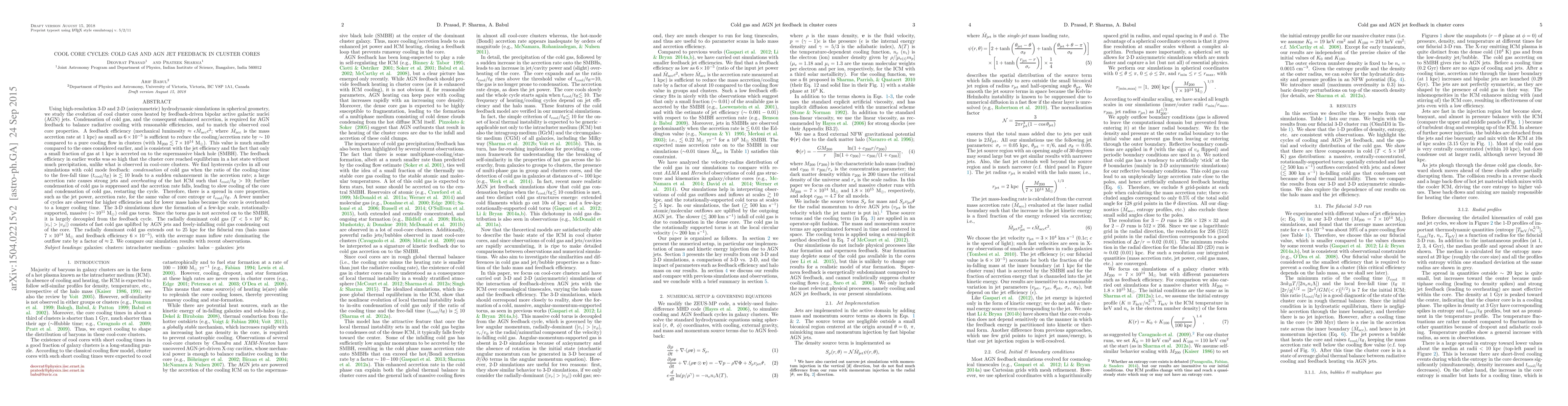 Using high-resolution 3-D and 2-D (axisymmetric) hydrodynamic simulations in spherical geometry, we study the evolution of cool cluster cores heated by feedback-driven bipolar active galactic nuclei (AGN) jets. Condensation of cold gas, and the consequent enhanced accretion, is required for AGN feedback to balance radiative cooling with reasonable efficiencies, and to match the observed cool core properties. A feedback efficiency (mechanical luminosity $\approx \epsilon \dot{M}_{\rm acc} c^2$; where $\dot{M}_{\rm acc}$ is the mass accretion rate at 1 kpc) as small as $5 \times 10^{-5}$ is sufficient to reduce the cooling/accretion rate by $\sim 10$ compared to a pure cooling flow. This value is smaller compared to the ones considered earlier, and is consistent with the jet efficiency and the fact that only a small fraction of gas at 1 kpc is accreted on to the supermassive black hole (SMBH). We find hysteresis cycles in all our simulations with cold mode feedback: {\em condensation} of cold gas when the ratio of the cooling-time to the free-fall time ($t_{\rm cool}/t_{\rm ff}$) is $\lesssim 10$ leads to a sudden enhancement in the accretion rate; a large accretion rate causes strong jets and {\em overheating} of the hot ICM such that $t_{\rm cool}/t_{\rm ff} > 10$; further condensation of cold gas is suppressed and the accretion rate falls, leading to slow cooling of the core and condensation of cold gas, restarting the cycle. Therefore, there is a spread in core properties, such as the jet power, accretion rate, for the same value of core entropy or $t_{\rm cool}/t_{\rm ff}$. A fewer number of cycles are observed for higher efficiencies and for lower mass halos because the core is overheated to a longer cooling time. The 3-D simulations show the formation of a few-kpc scale, rotationally-supported, massive ($\sim 10^{11} M_\odot$) cold gas torus. (abstract abridged)