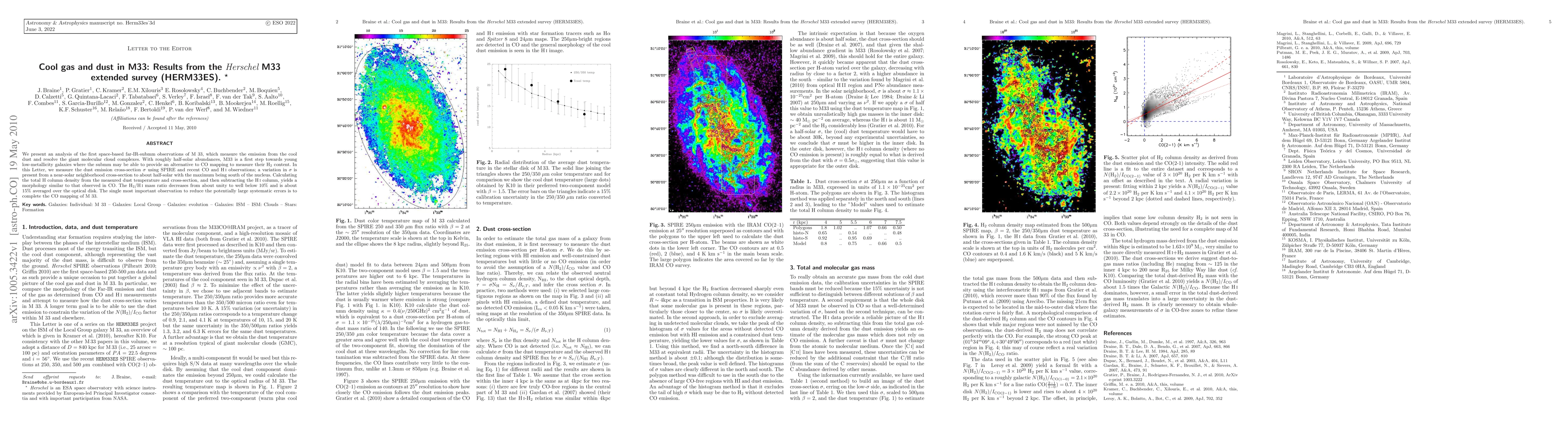 The Herschel M33 extended survey (HERM33ES) reveals that M33, with half-solar metallicity, offers insights into low-metallicity galaxies. Dust emission cross-section varies across M33, with CO and HI observations used to calculate H2/HI mass ratio, which decreases from near unity to about 15% over the optical disk. Completing CO mapping is crucial to reduce systematic errors.