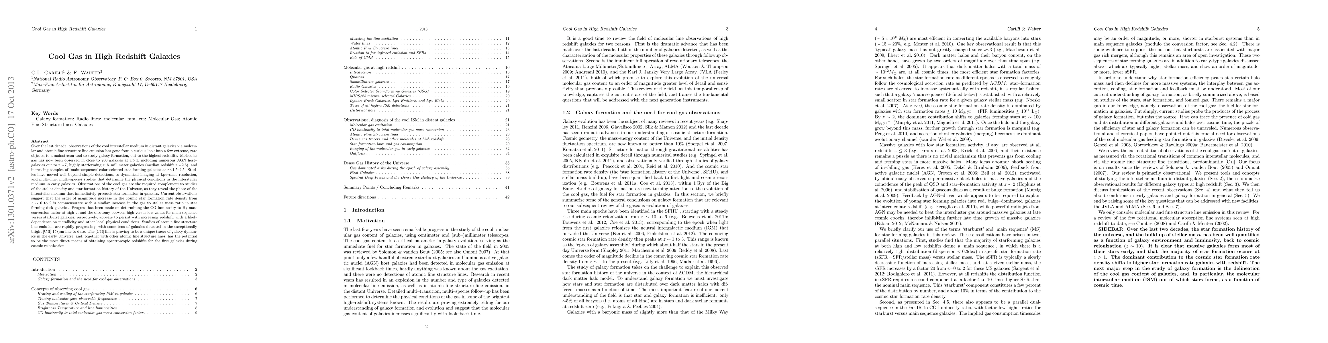 Over the last decade, observations of the cool interstellar medium in distant galaxies via molecular and atomic fine structure line emission has gone from a curious look into a few extreme, rare objects, to a mainstream tool to study galaxy formation, out to the highest redshifts. Molecular gas has now been observed in close to 200 galaxies at z>1, including numerous AGN host-galaxies out to z~7, highly starforming sub-millimeter galaxies (median redshift z~2.5), and increasing samples of 'main-sequence' star forming galaxies at z~1.5-2.5. Studies have moved well beyond simple detections, to dynamical imaging at kpc-scale resolution, and multi-line, multi-species studies that determine the physical conditions in the interstellar medium. Observations of the cool gas are the required complement to studies of the stellar density and star formation history of the Universe, as they reveal the phase of the interstellar medium that immediately precedes star formation. Current observations suggest that the order of magnitude increase in the cosmic star formation rate density from z~0 to 2 is commensurate with a similar increase in the gas to stellar mass ratio in star forming disk galaxies. Progress has been made on determining the CO luminosity to H_2 mass conversion factor at high-z, and the dichotomy between high versus low depletion time values for main sequence versus starburst galaxies, respectively, with a likely dependence on metallicity and other local physical conditions. Studies of atomic fine structure line emission are rapidly progressing, with some tens of galaxies detected in the exceptionally bright [CII] 158 micron line to date. This line is proving to be a unique tracer of galaxy dynamics in the early Universe and has the potential to be the most direct means of obtaining spectroscopic redshifts for the first galaxies during cosmic reionization.