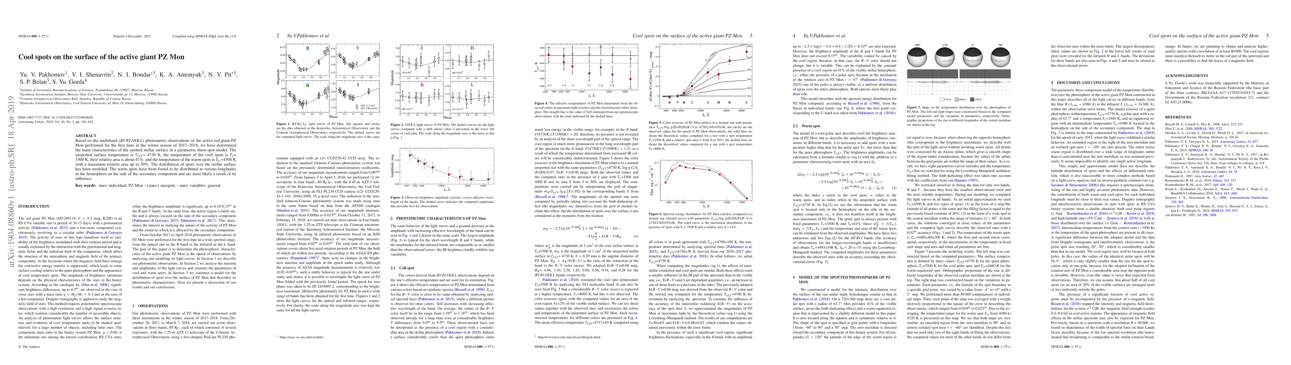 The study of active red giant PZ Mon reveals its surface features using multiband photometric observations. Key findings include unspotted surface temp of 4730K, cool spot temp of 3500K covering ~41% of the surface, and warm spots at up to 20% area with a temp of 4500K. Warm spots' distribution suggests influence from the secondary component.
