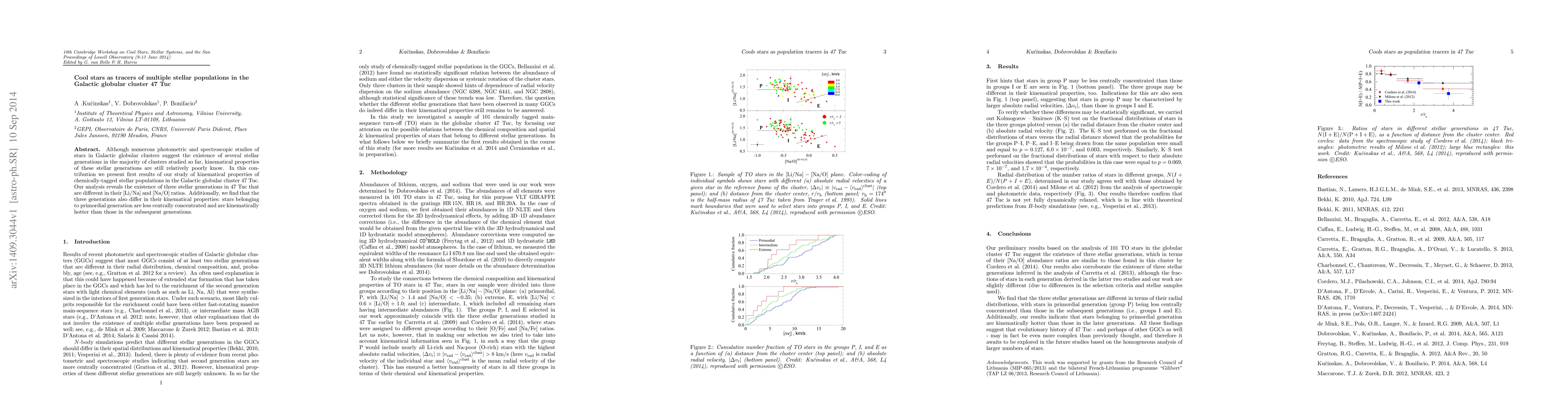 Although numerous photometric and spectroscopic studies of stars in Galactic globular clusters suggest the existence of several stellar generations in the majority of clusters studied so far, kinematical properties of these stellar generations are still relatively poorly know. In this contribution we present first results of our study of kinematical properties of chemically-tagged stellar populations in the Galactic globular cluster 47 Tuc. Our analysis reveals the existence of three stellar generations in 47 Tuc that are different in their [Li/Na] and [Na/O] ratios. Additionally, we find that the three generations also differ in their kinematical properties: stars belonging to primordial generation are less centrally concentrated and are kinematically hotter than those in the subsequent generations.