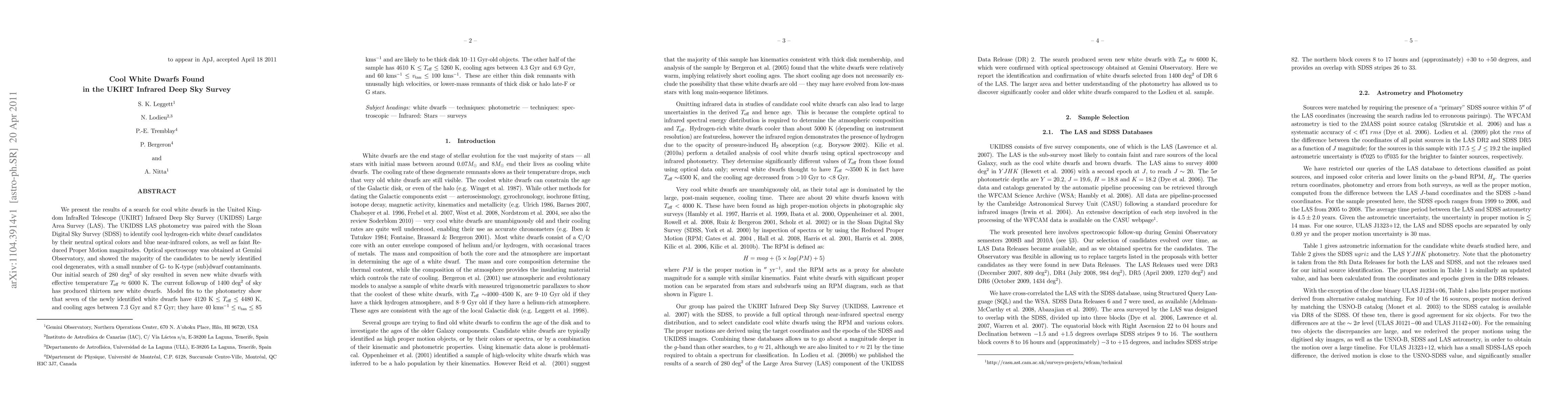 This study identifies cool white dwarfs using UKIRT Infrared Deep Sky Survey data, cross-referencing with SDSS for optical colors and near-infrared data. The research found 20 new cool white dwarfs, with most exhibiting characteristics of thick disk objects, while others may represent thin disk remnants or lower-mass remnants of late-F or G stars.