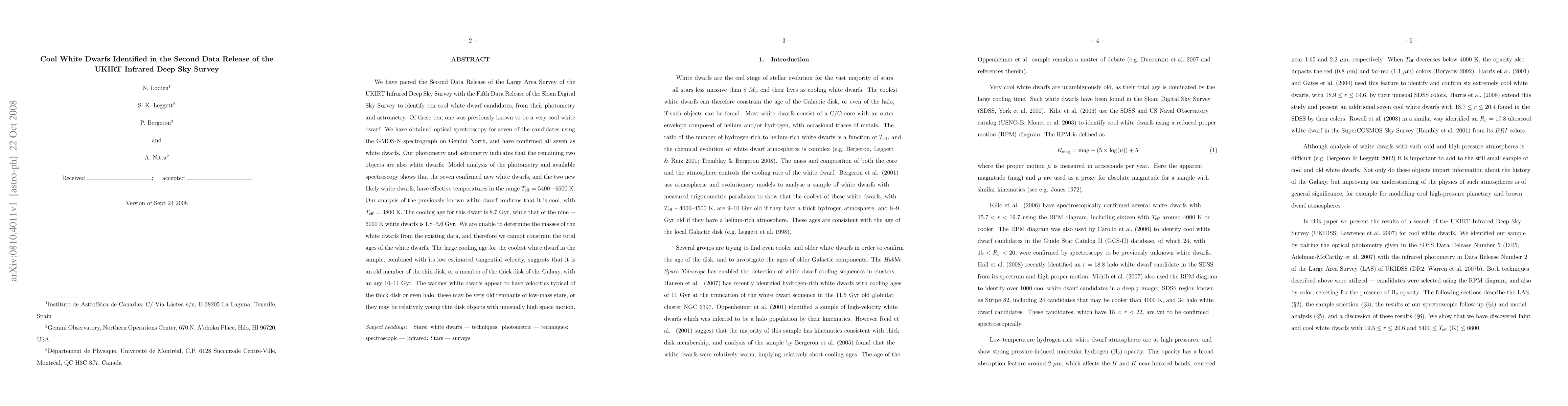 This paper identifies ten cool white dwarf candidates using data from the UKIRT Infrared Deep Sky Survey and the Sloan Digital Sky Survey, confirming seven with optical spectroscopy. The white dwarfs range in temperature from 3800 K to 6600 K, with the oldest estimated at 8.7 Gyr, suggesting it may belong to the thin or thick disk of the Galaxy.