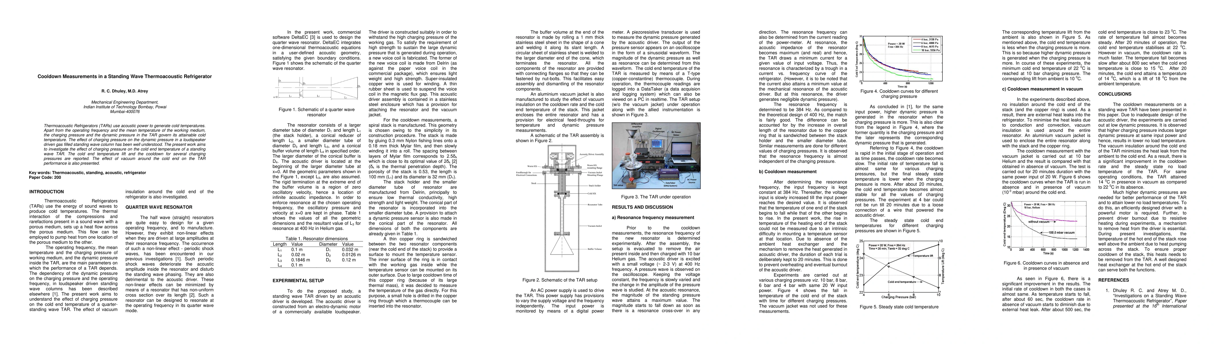 This study investigates the impact of varying charging pressures on the cold end temperature and cooldown performance in a standing wave thermoacoustic refrigerator, reporting temperature lift and cooldown effects, and examining the influence of vacuum around the cold end on overall performance.