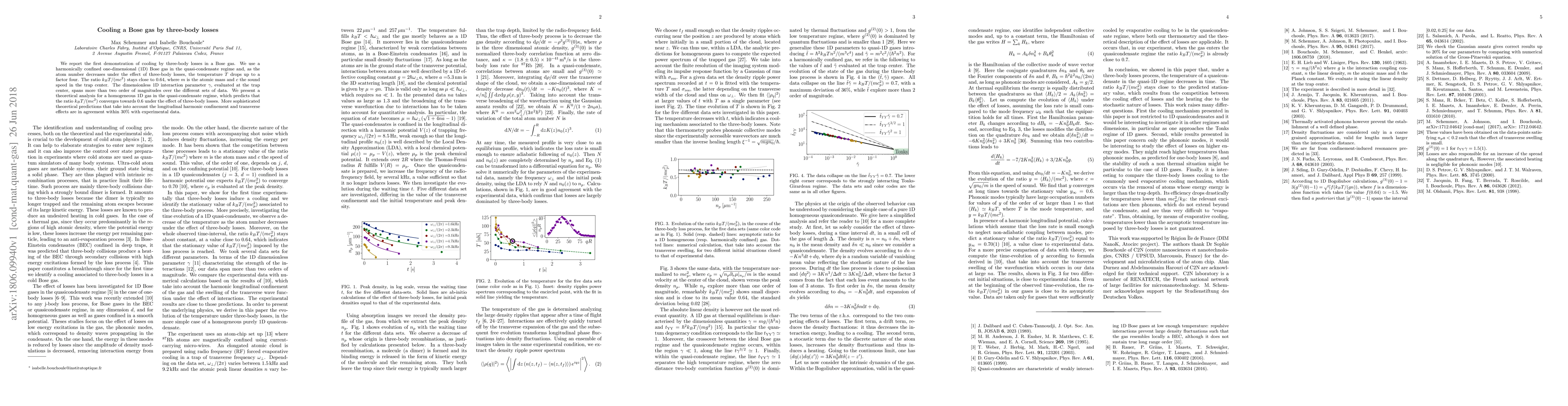 This paper demonstrates the cooling of a one-dimensional Bose gas via three-body losses, achieving a temperature drop up to four times, while maintaining a ratio of $k_B T/(m c^2)$ near 0.64. Theoretical models align with experimental results, predicting the temperature ratio convergence towards 0.6 under three-body loss conditions.