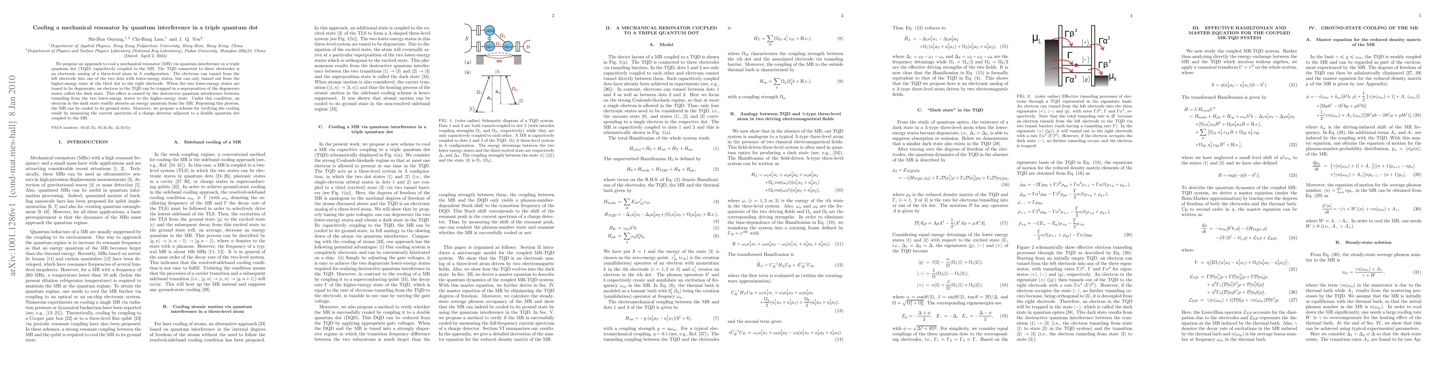 This paper proposes a method to cool a mechanical resonator using quantum interference in a triple quantum dot, which acts as a three-level atom. By tuning the lower-energy states to be degenerate, the system can trap electrons in a dark state, enabling the absorption of energy from the resonator and cooling it to its ground state.