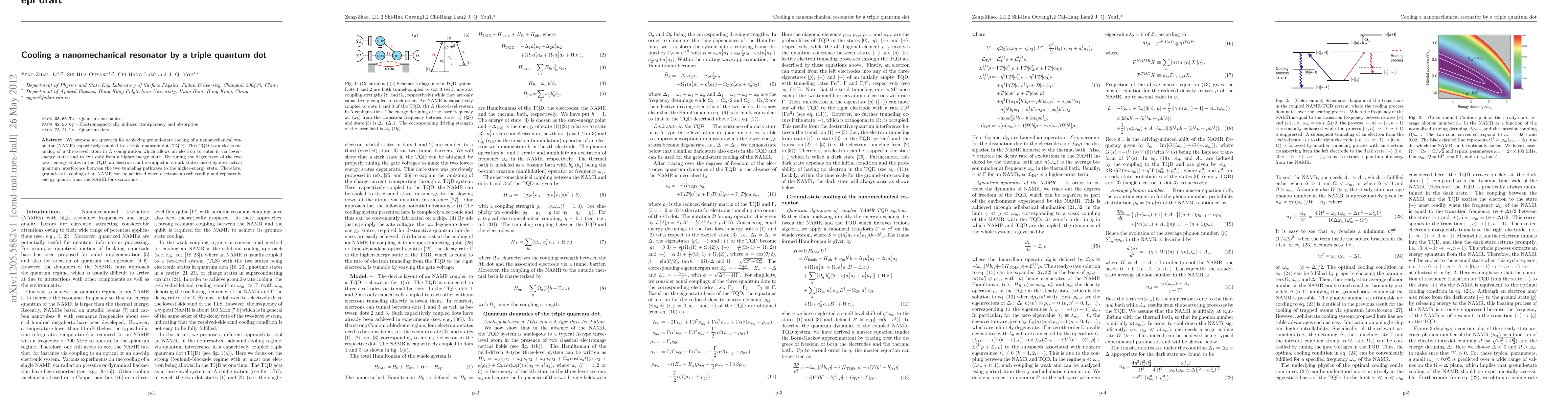 This paper proposes a method to cool a nanomechanical resonator to its ground state by coupling it to a triple quantum dot, which functions as an electronic analog of a three-level atom. The TQD's unique configuration allows electrons to repeatedly absorb energy quanta from the resonator, facilitating its ground-state cooling.