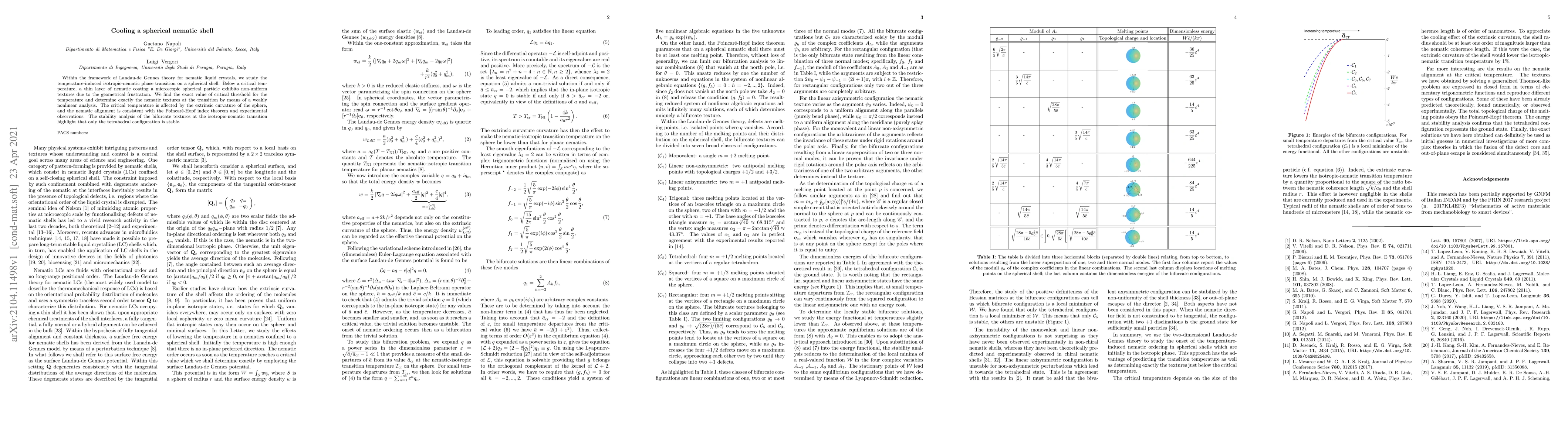 This paper investigates the temperature-induced isotropic-nematic phase transition on a spherical nematic shell using Landau-de Gennes theory, finding a critical temperature and non-uniform textures due to geometrical frustration. The study concludes that only the tetrahedral configuration of nematic textures is stable at the transition.